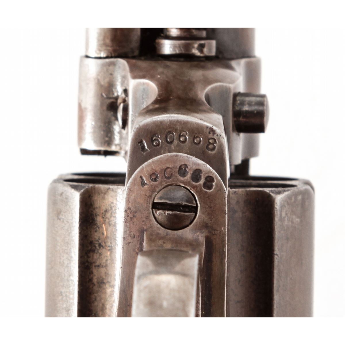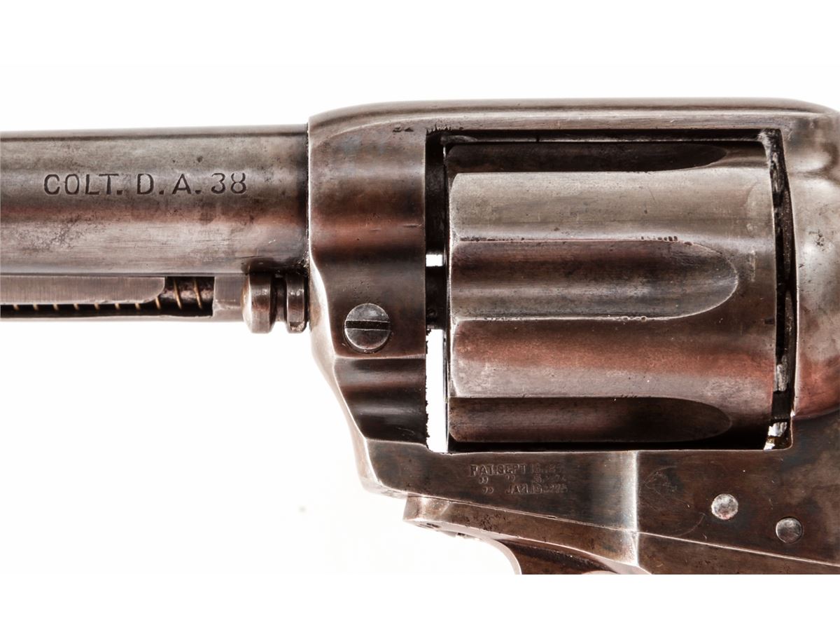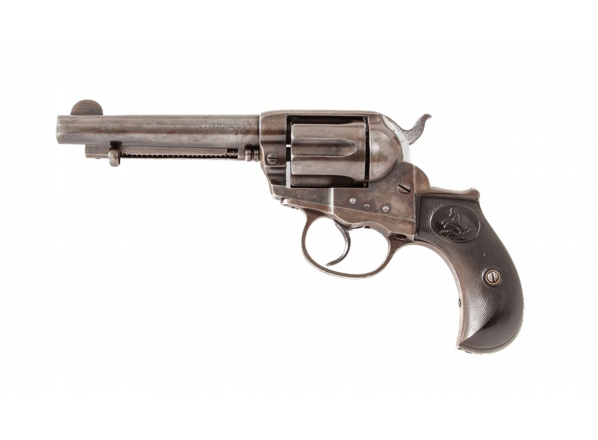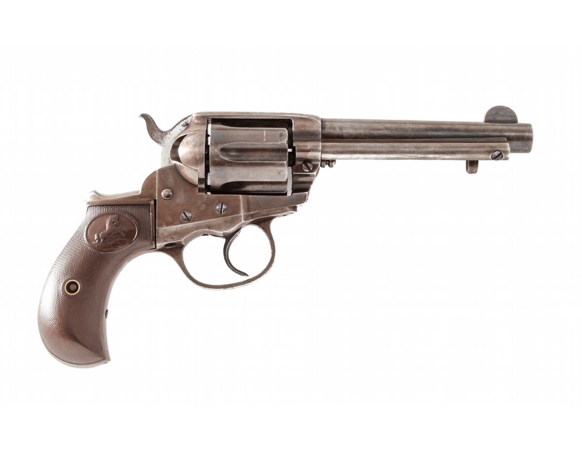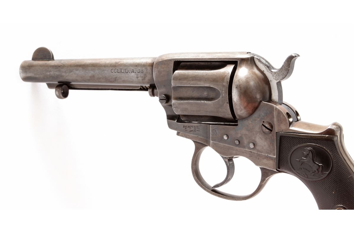 Colt Lightning Double Action Revolver, #160668, .38 Colt cal., 4-1/2'' barrel, blue and case hardened finish, factory checkered hard rubber grips. Mfg'd 1906. Condition is very good retaining approx. 40% blue to cylinder and barrel, and 30% muted and toning case colors to frame. Grips with mild flattening and possible replaced grip screw. Good action and bore. Est.: $450-$600. (C&R/PPT)
