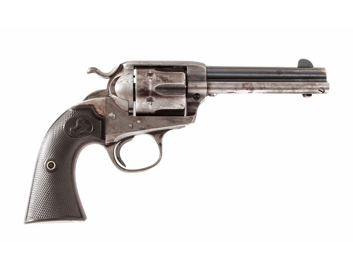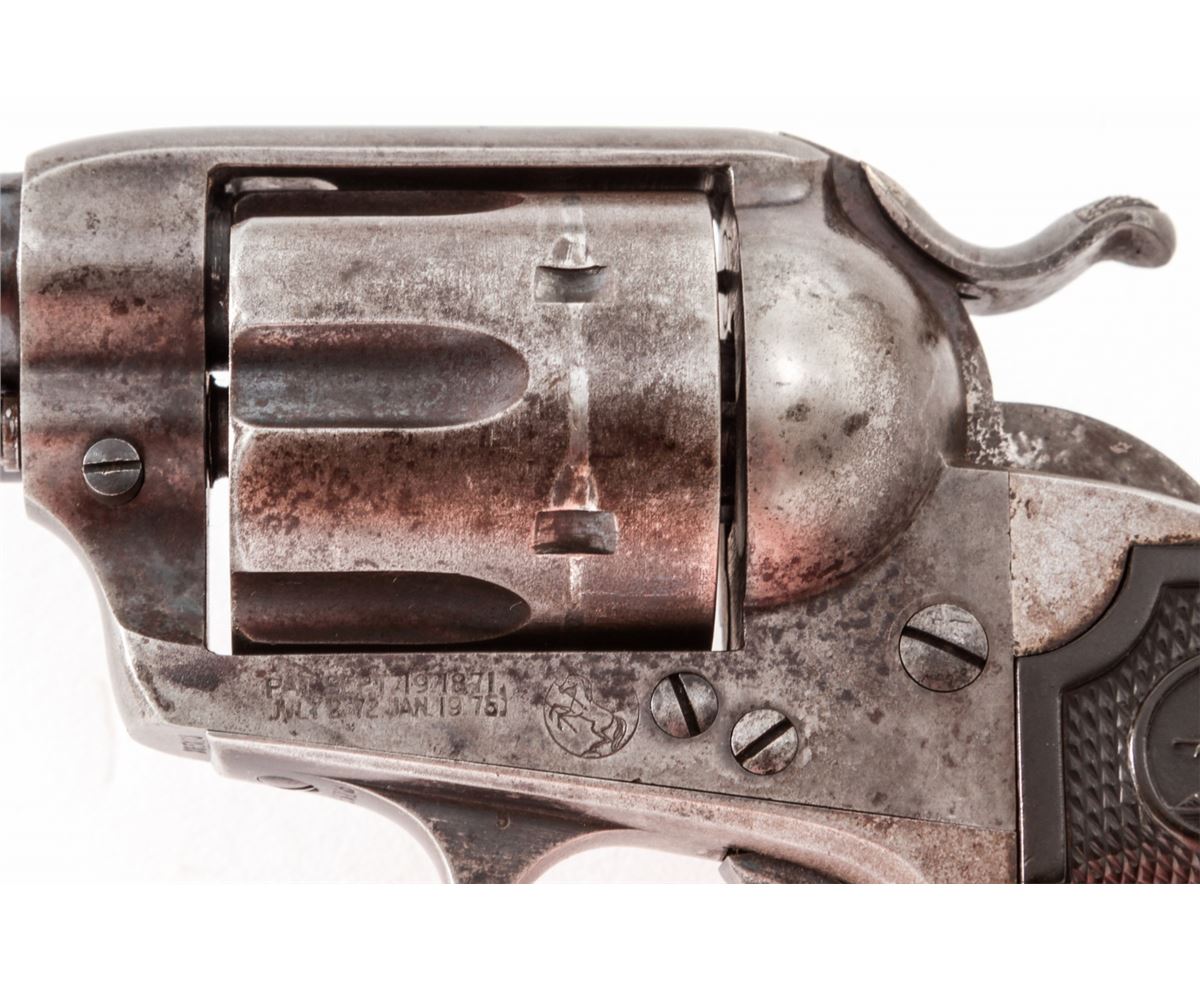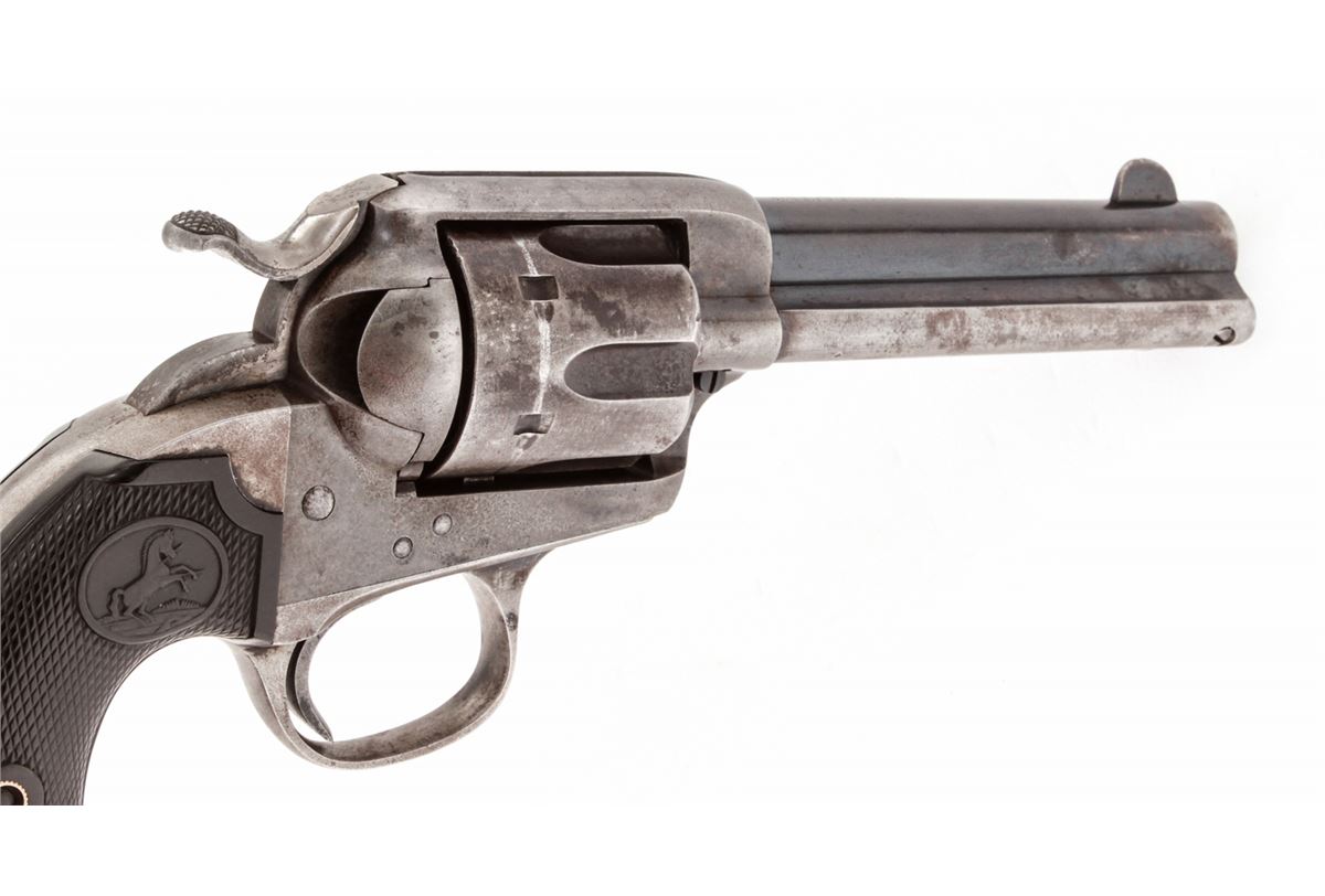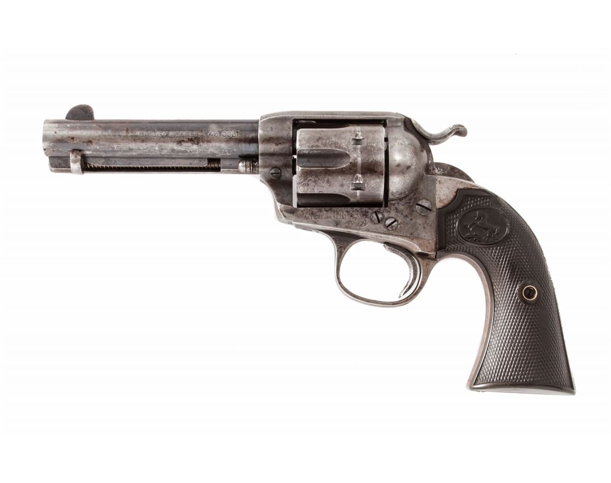 Colt Bisley Single Action Revolver, #265813, .45 Colt cal., 4-3/4'' barrel, blue finish, factory checkered hard rubber grips. Mfg'd 1905. Condition is good retaining approx. 60% toning blue. Grips with moderate flattening. Good action and bright bore. Est.: $1,000-$1,500. (C&R/PPT)