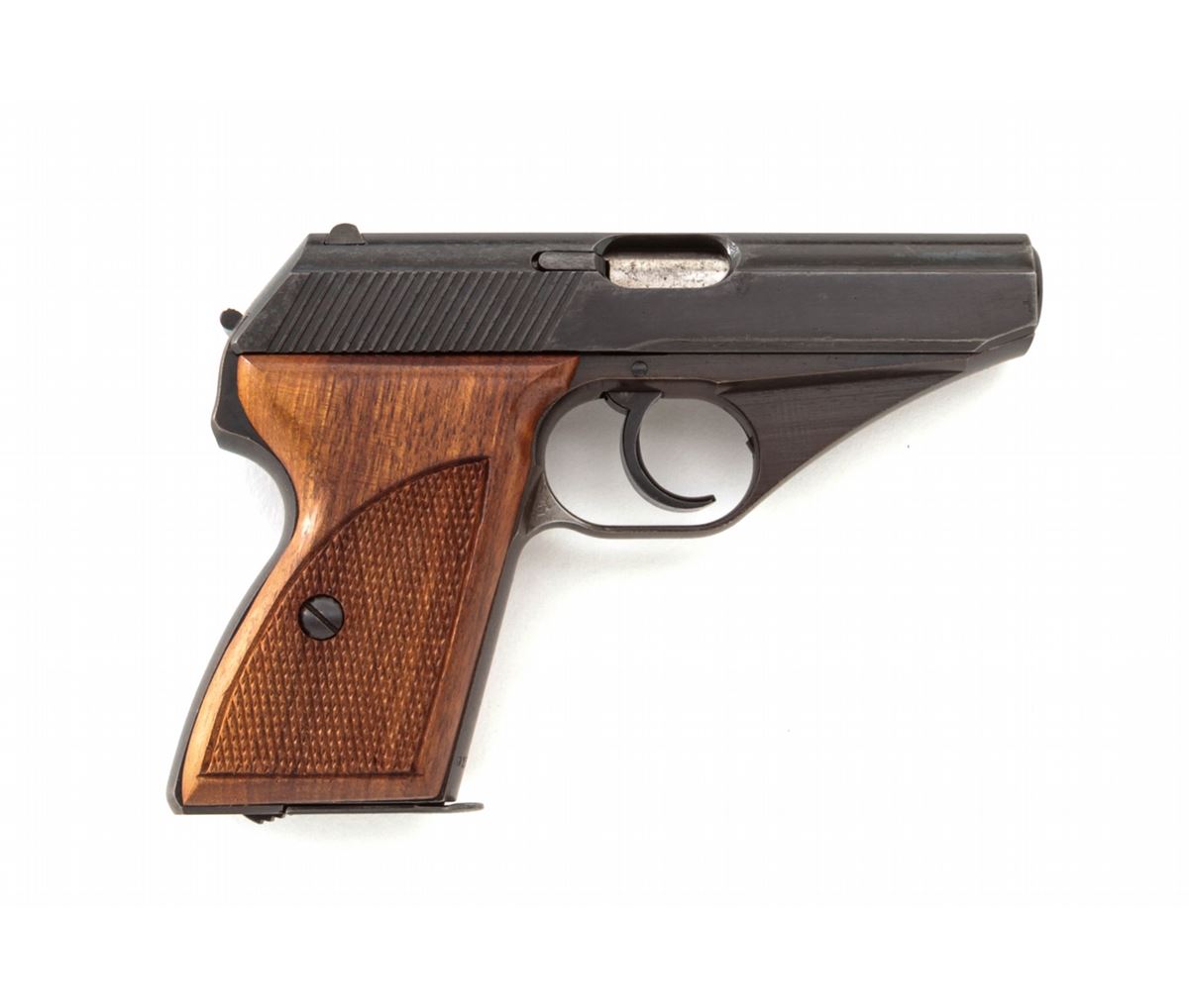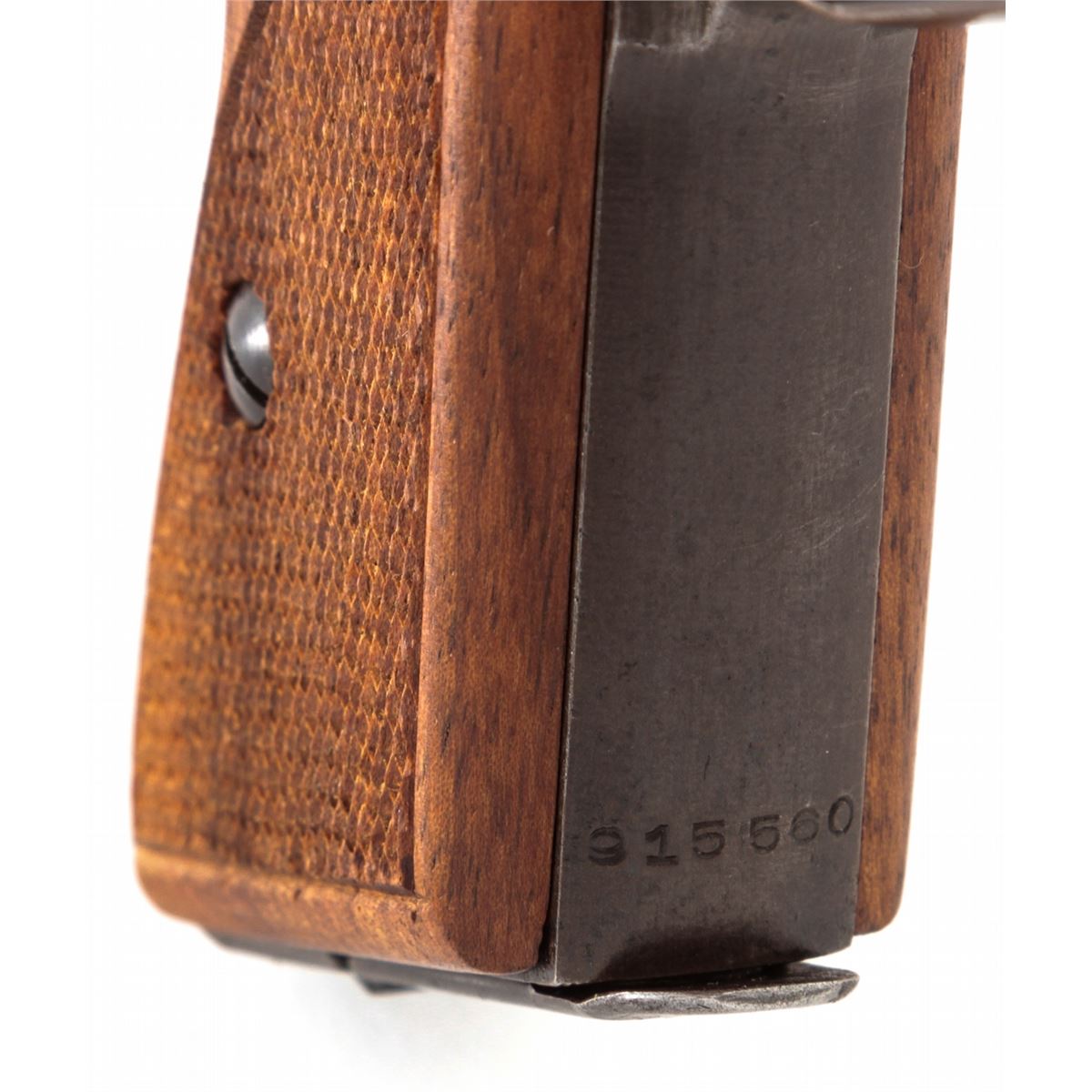 Pre-War Mauser HSc Semi-Automatic Pistol, #915560, .32 ACP cal., 3-1/4'' barrel, blue finish, factory checkered walnut grips, ''WaA 135'' ampt to triggerguard and ''(eagle)/N'' to right side, with one original and one aftermarket magazine. Condition is fine retaining approx, 85% blue with most of the losses to left side of slide. Grips remain exceptionally crisp, action is good, bore is mirror bright. Est.: $300-$500. (C&R)
