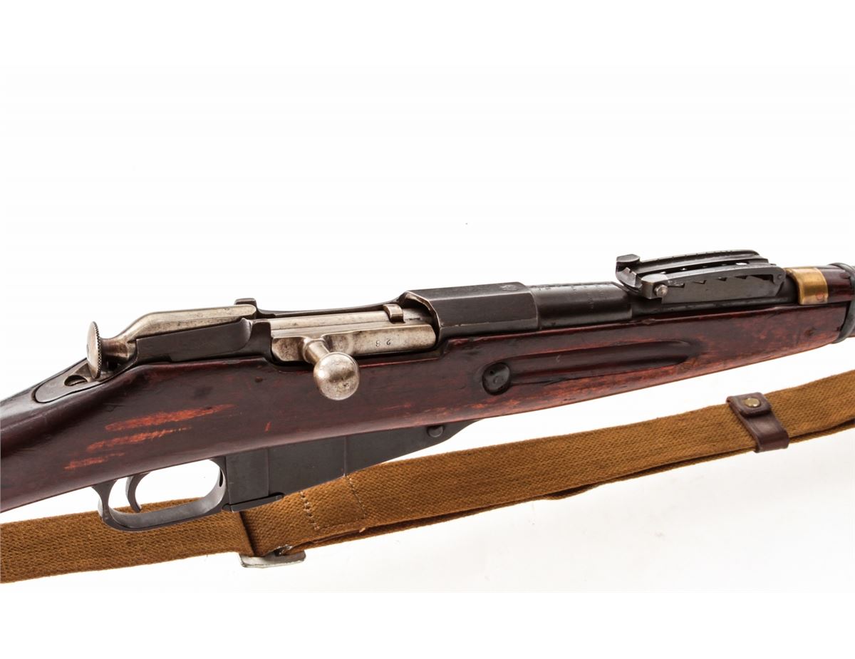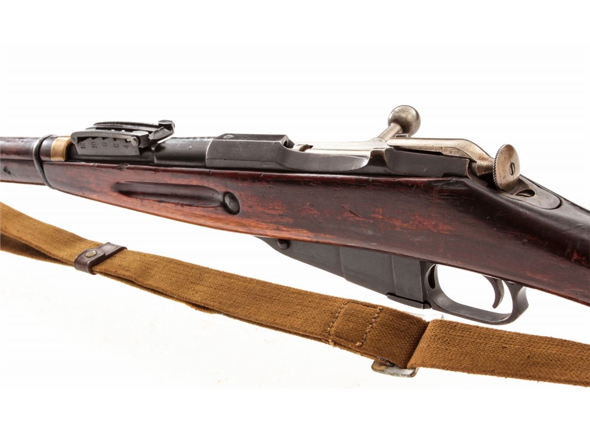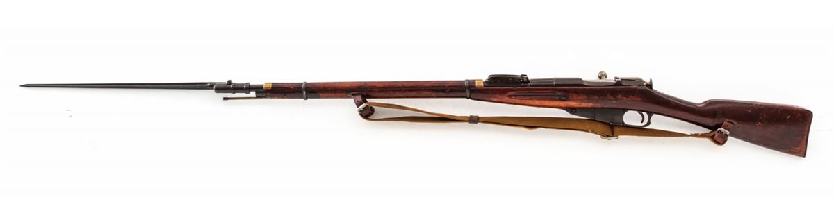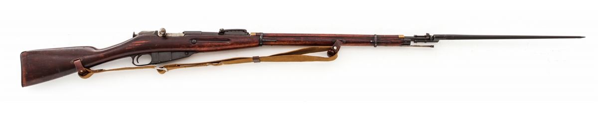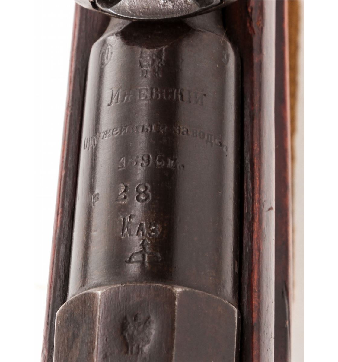 Antique Mosin-Nagant Model 1891 Bolt Action Dragoon Rifle, #28, 7.62x54R cal., 28.7'' barrel, blue finish, European hardwood stock, dated 1896, with sling and spike bayonet. Condition is very good retaining approx. 85% toning blue. Stock with scuffs and scratches. Mostly matching small parts. Good action and bore. Est.: $250-$450. (Antique)