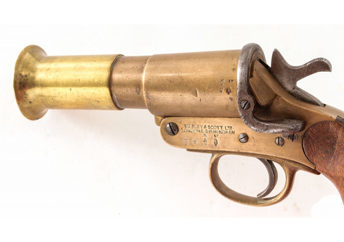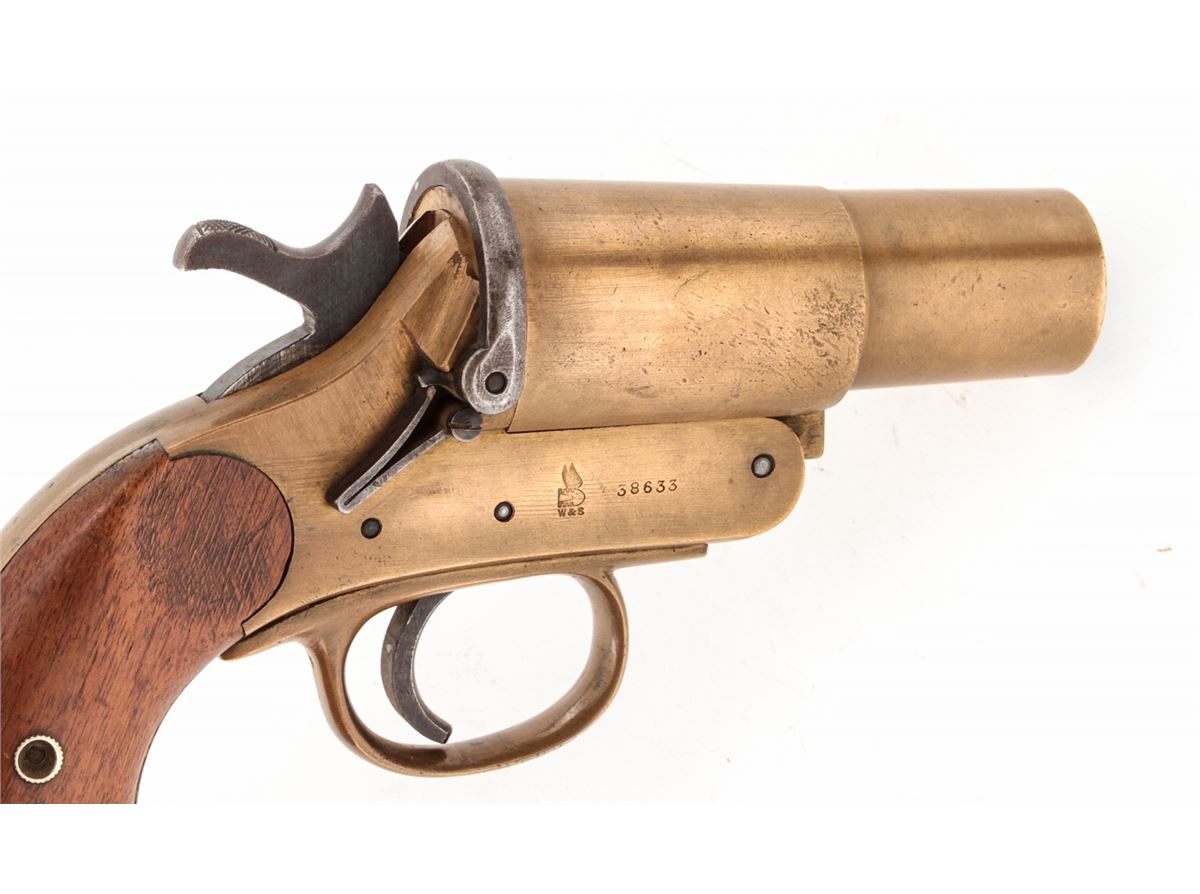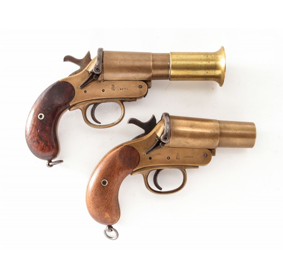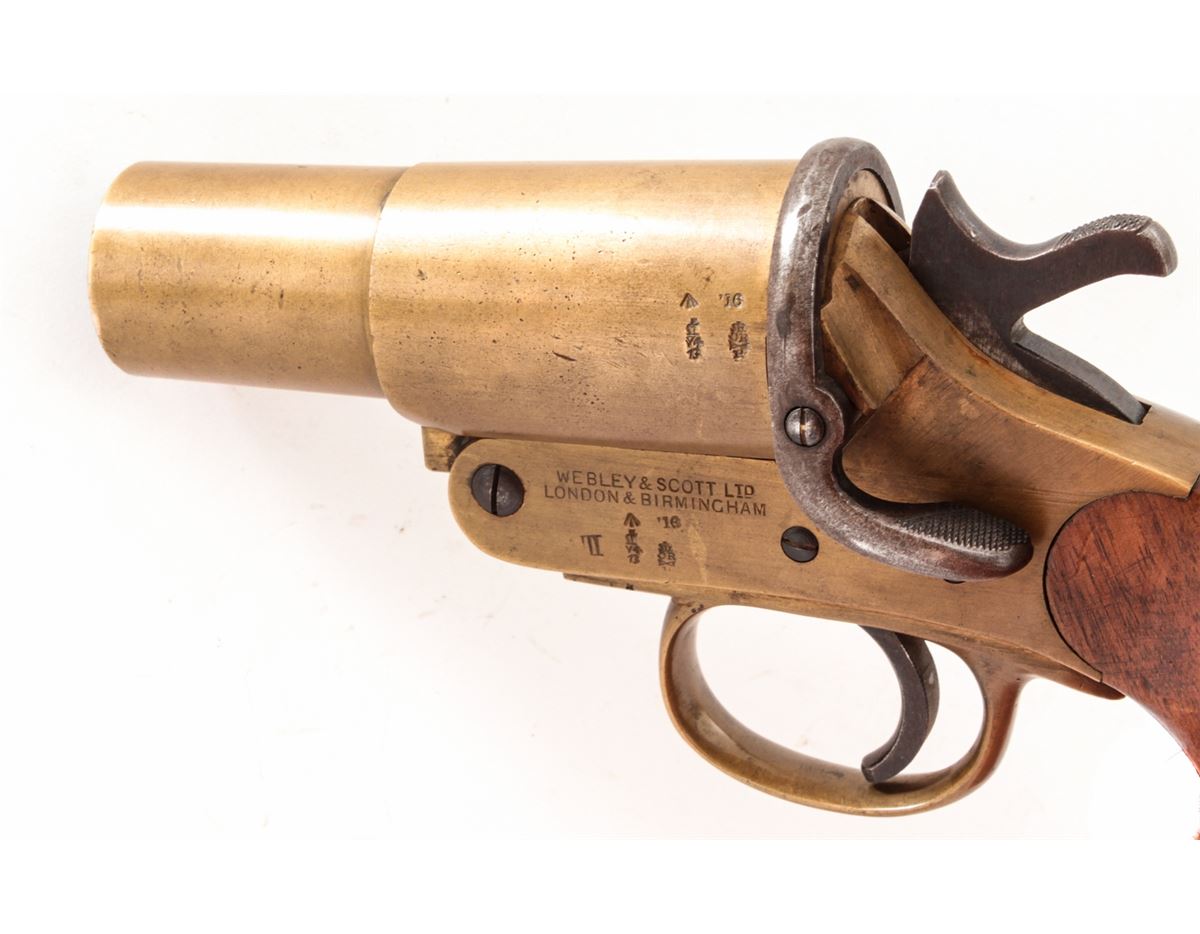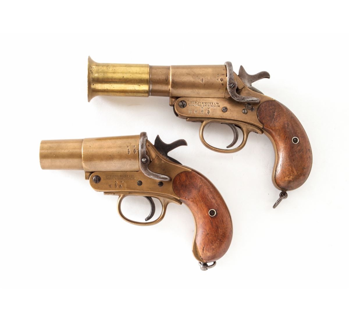 Lot of Two (2) WWI Era Webley & Scott Very Pistols: (1) #38633, 1'' dia. bore, 4'' brass barrel, brass frame, and smooth walnut grips, with full complement of English proofmarks including broad arrow and 1916 date. Condition is excellent with light even patination, and loss at toe of left grip panel. Good action, fine bore. (2) Similar flare pistol, #58751, 1'' dia. bore, originally 4'' barrel with later added 2-1/2'' flared brass tip. Condition is fine with similar proofmarks, 1917 date, and light scuffs and scratches. Grips are solid with some oil darkening. Good action, fine bore. Est.: $300-$500/lot.