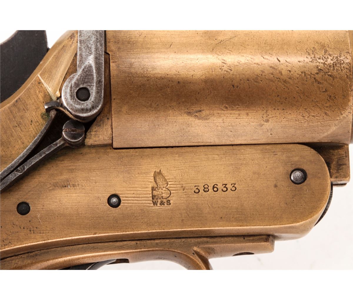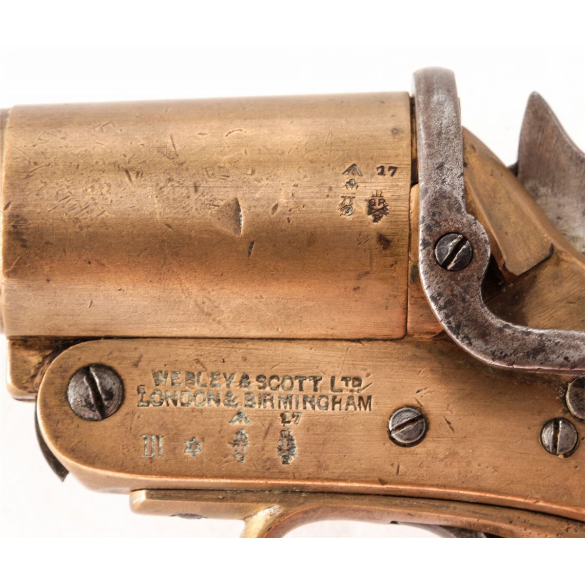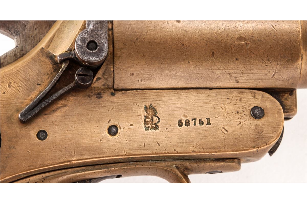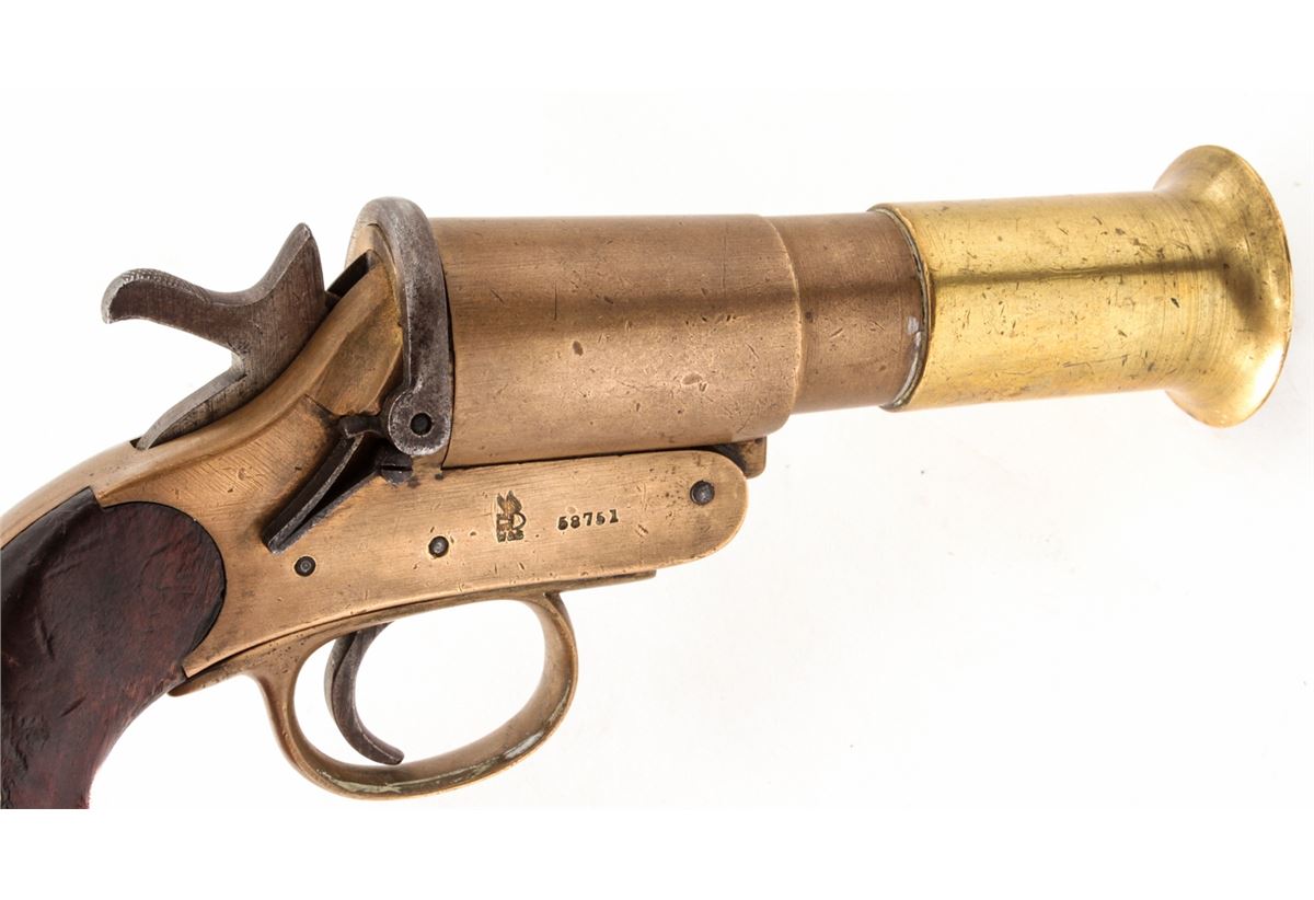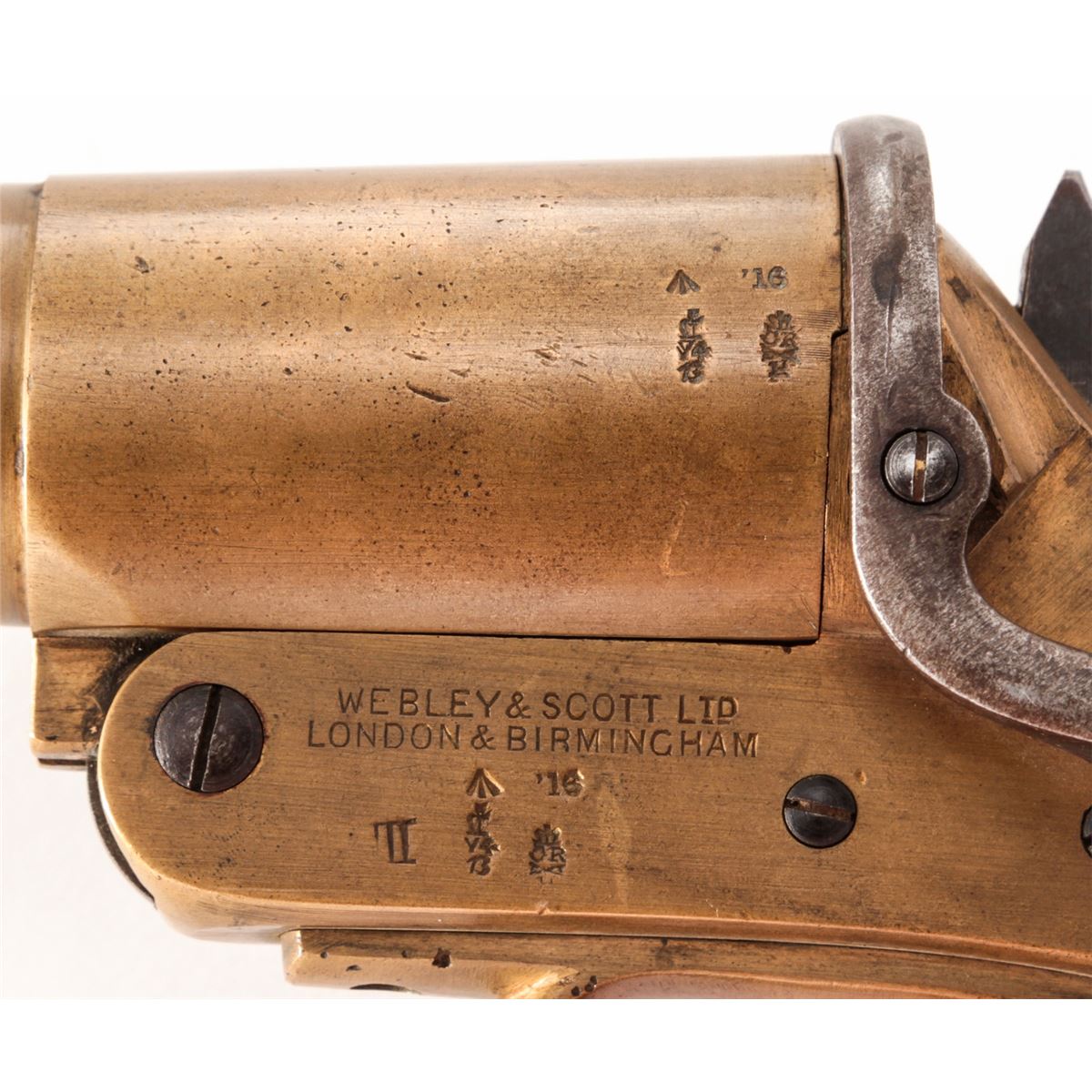 Lot of Two (2) WWI Era Webley & Scott Very Pistols: (1) #38633, 1'' dia. bore, 4'' brass barrel, brass frame, and smooth walnut grips, with full complement of English proofmarks including broad arrow and 1916 date. Condition is excellent with light even patination, and loss at toe of left grip panel. Good action, fine bore. (2) Similar flare pistol, #58751, 1'' dia. bore, originally 4'' barrel with later added 2-1/2'' flared brass tip. Condition is fine with similar proofmarks, 1917 date, and light scuffs and scratches. Grips are solid with some oil darkening. Good action, fine bore. Est.: $300-$500/lot.