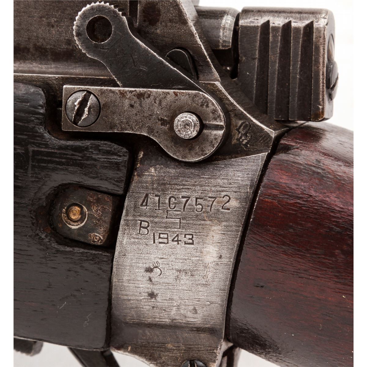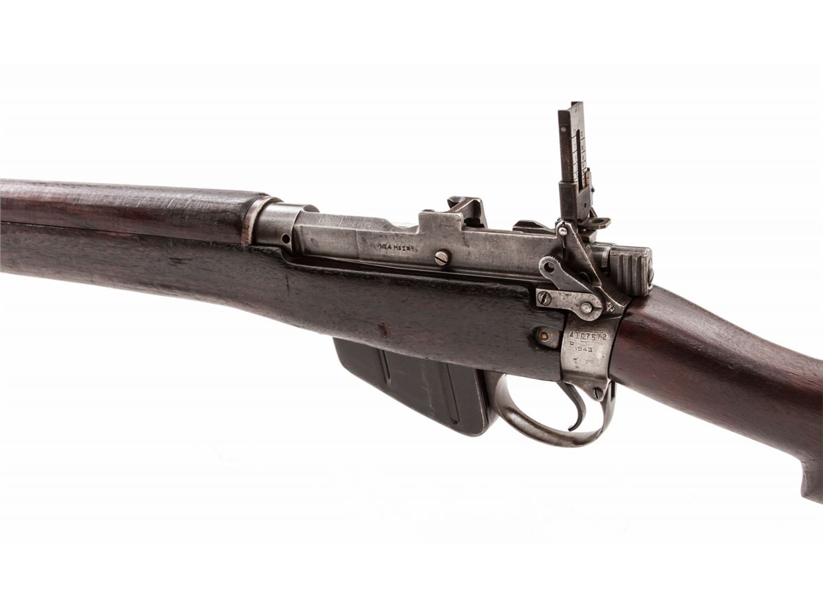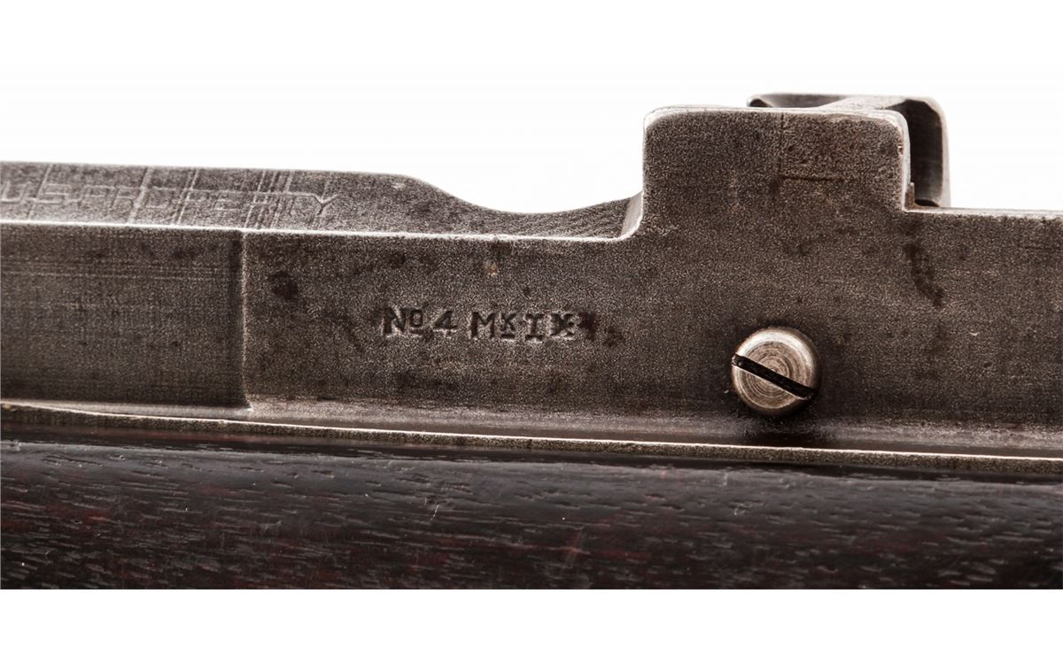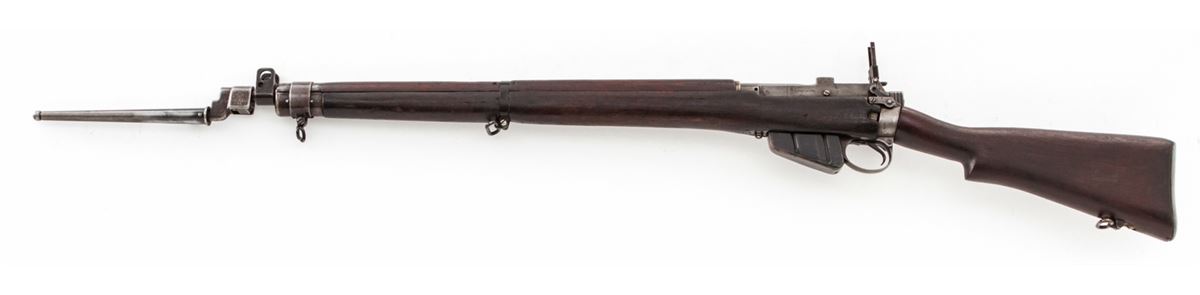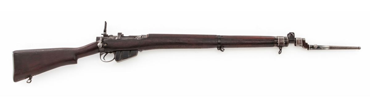 U.S. Property marked Savage No. 4 MK 1* Bolt Action Rifle (1943), #41C7572, .303 cal., 25'' barrel, phosphate finish, walnut stock, with spike bayonet. Condition is very good as import marked at muzzle, retaining approx. 60% original finish. Walnut stock with oil darkening, dings and scuffs. Good action, bright bore. Est.: $300-$500. (C&R)
