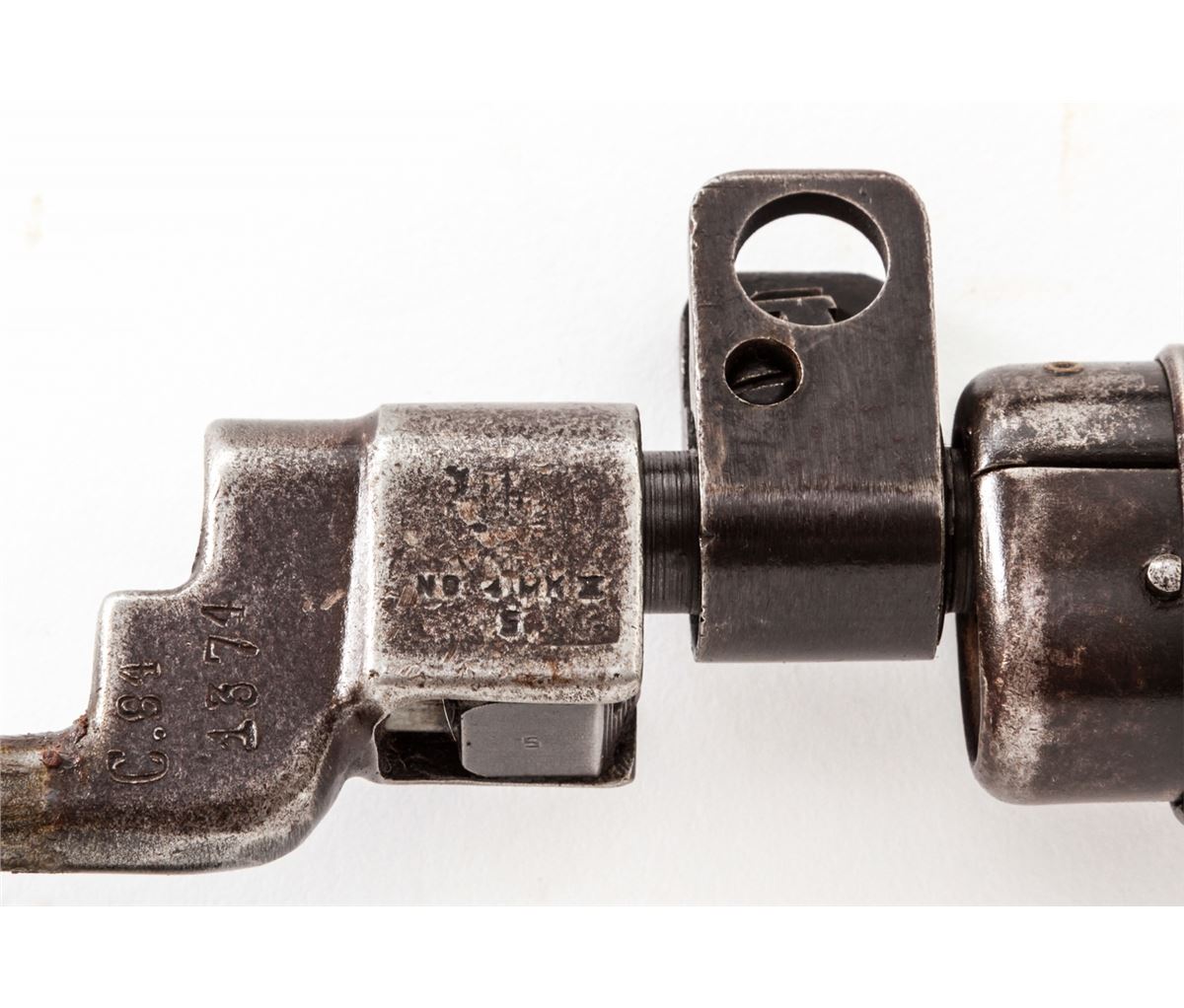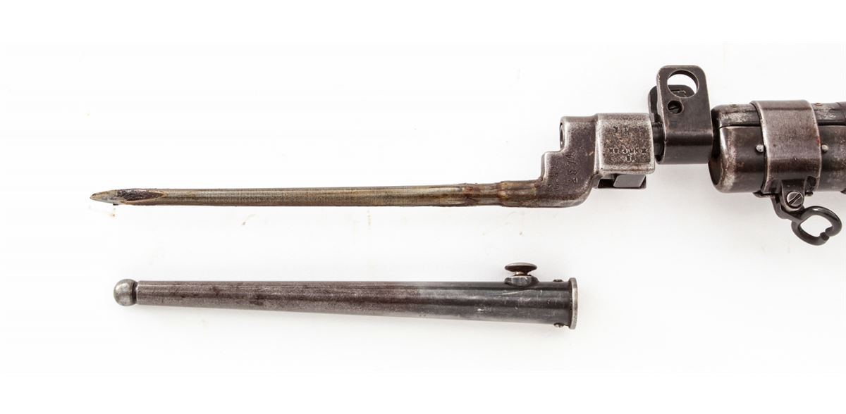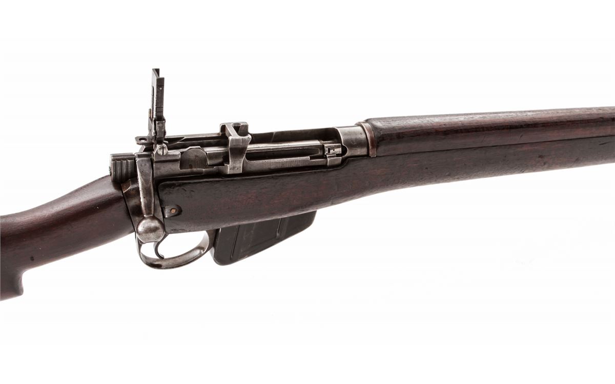 U.S. Property marked Savage No. 4 MK 1* Bolt Action Rifle (1943), #41C7572, .303 cal., 25'' barrel, phosphate finish, walnut stock, with spike bayonet. Condition is very good as import marked at muzzle, retaining approx. 60% original finish. Walnut stock with oil darkening, dings and scuffs. Good action, bright bore. Est.: $300-$500. (C&R)