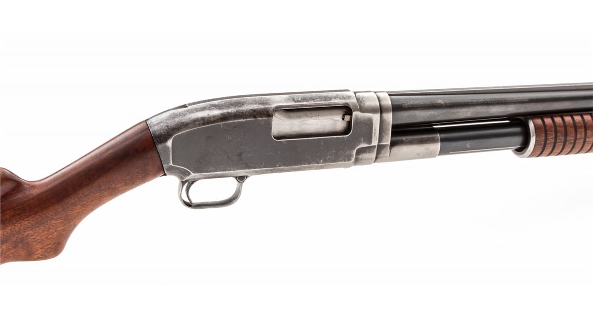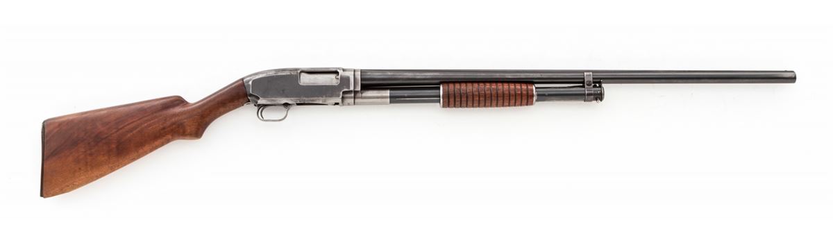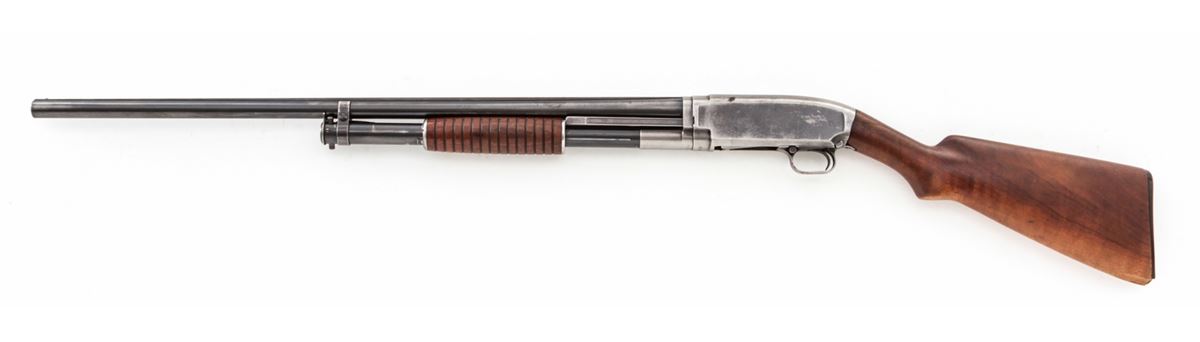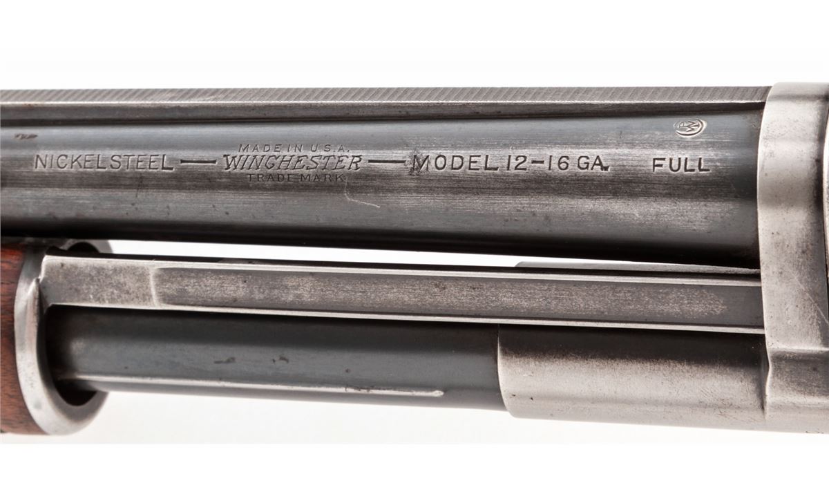 Winchester Model 12 Pump Action Shotgun, #436809, 16 ga., 28'' game rib barrel choked Full, blue finish, walnut stock. Mfg'd 1926. Condition is good to very good retaining approx. 80% thinning blue. Stock with loss at toe and small fracture near metal contact point at frame. Slightly deformed triggerguard. Good action and bore. Est.: $200-$400. (C&R)