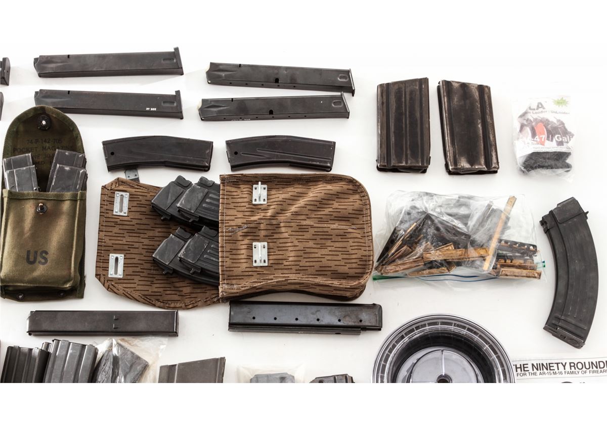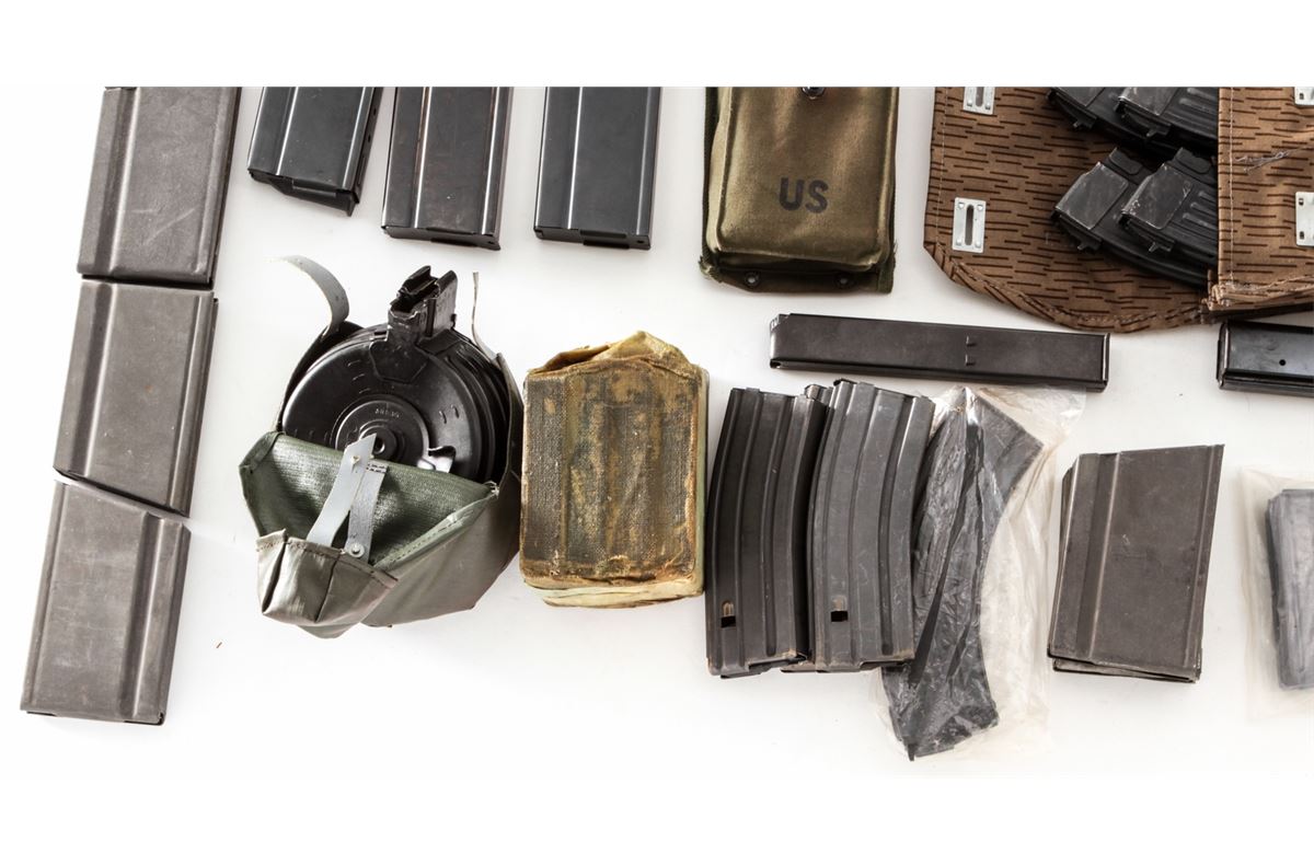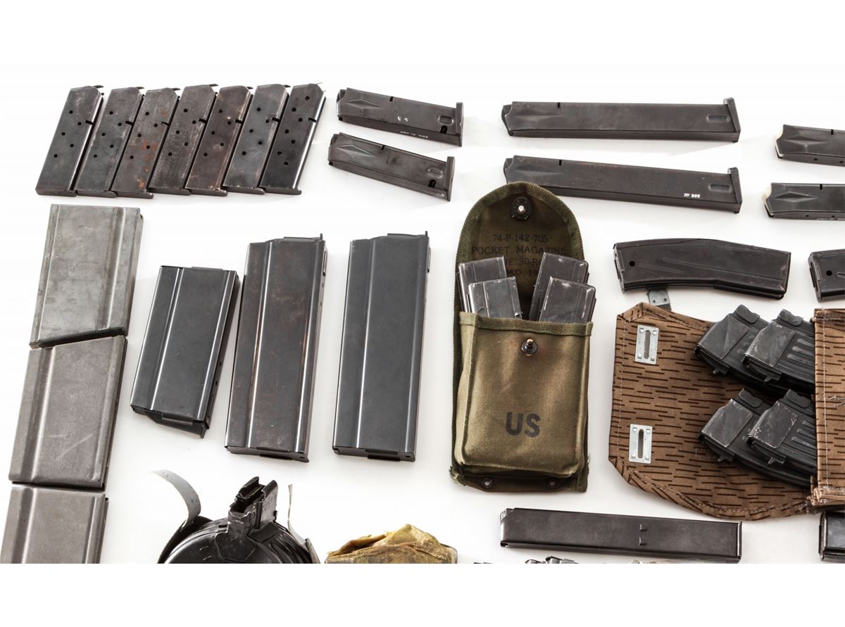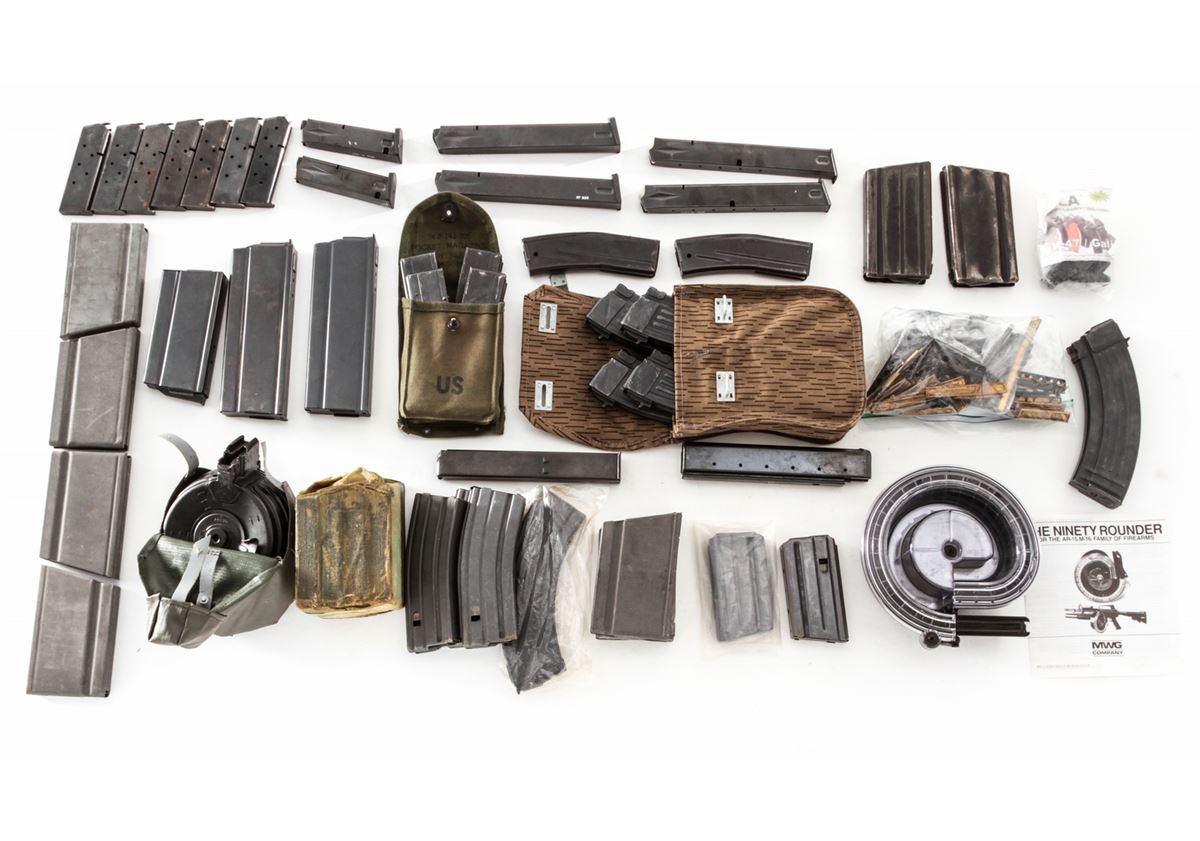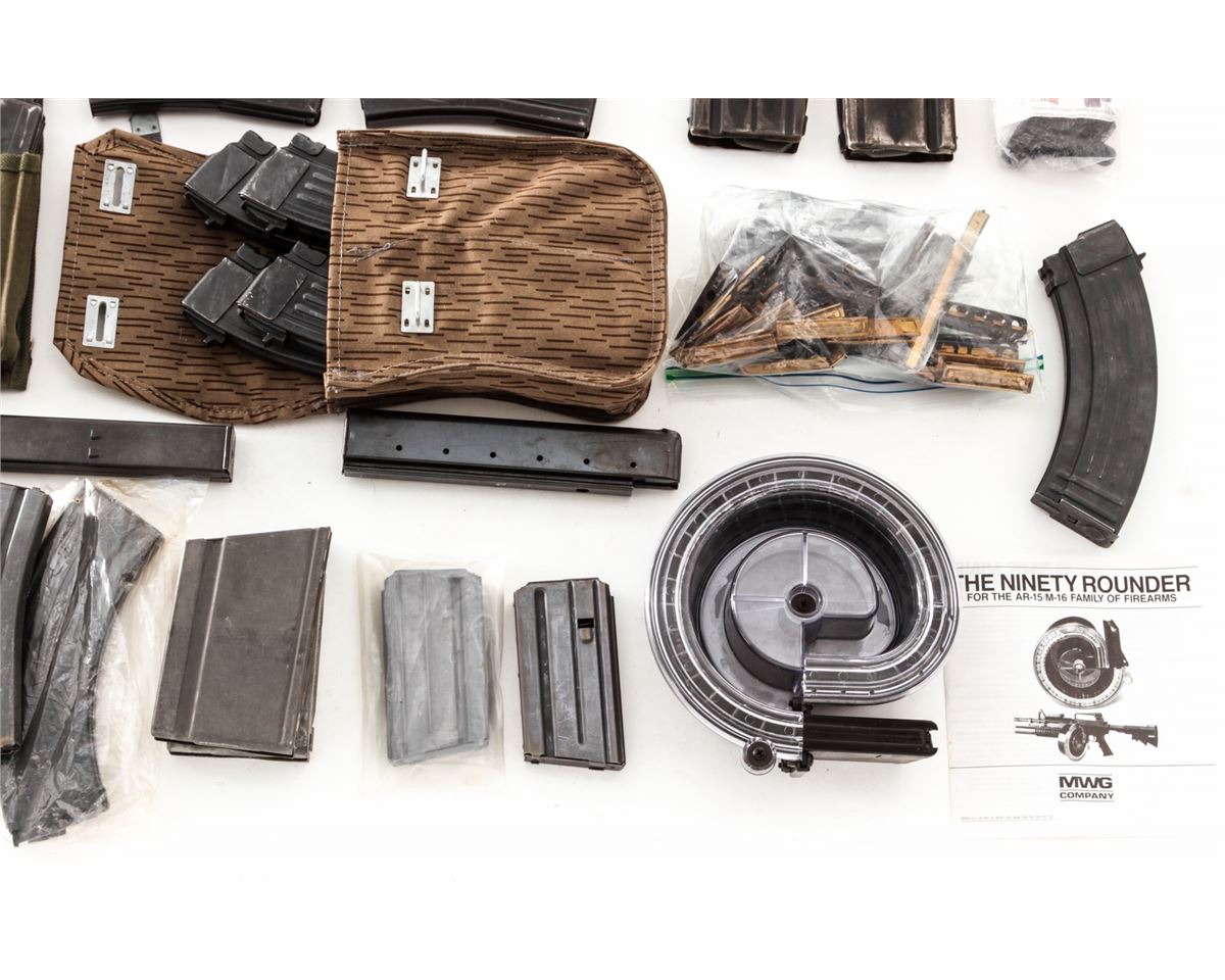 Lot of Rifle and Pistol Magazines, including eleven (11) WWII BAR magazines, five still in the original wrap; one AR-15 90-round plastic drum, by MWG Co.; six (6) high-capacity Beretta magazines, two 15-rounders and four 30-round mags; one 30-round SKS or AK-47 type rifle magazine; one 30-round aftermarket Uzi magazine; high-capacity drum for Chinese AK type rifle, with rubberized pouch; three (3) Circle-K 30-round magazines for AR-15; two (2) metric FAL magazines; one 30-round Thompson SMG mag; two (2) aftermarket 30-round M1A magazines and one 20-round M1A magazine; one Ruger Mini-30 magazine by USA Mags; two (2) 20-round Colt marked AR-15 magazines; six (6) 30-round M1 Carbine mags, some in canvas pouch; and four (4) 30-round MAC-90 magazines. Plus a good assortment of bolt rifle stripper clips, and seven (7) various 7-round magazines for Model 1911 pistols. Est.: $500-$750/lot.