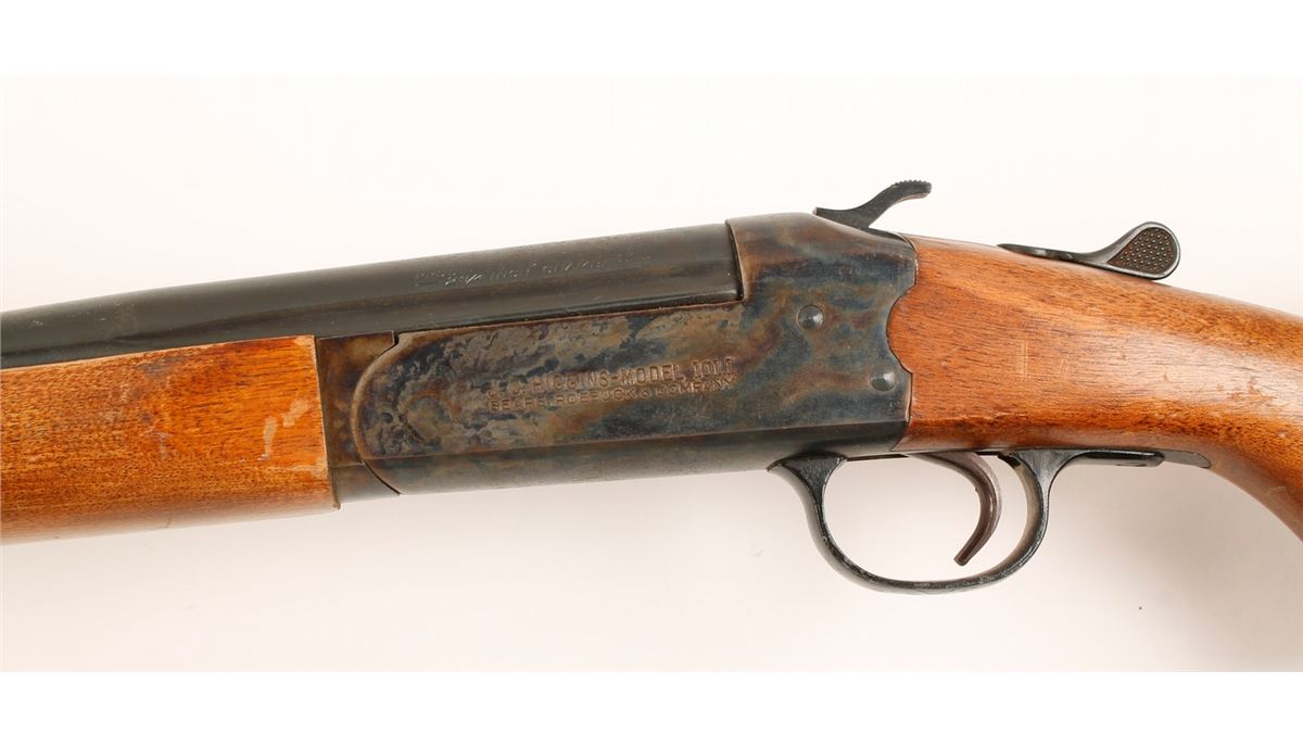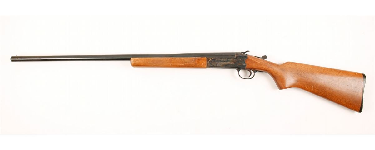 Blued and case-colored single-shot exposed hammer break-top shotgun with a 28" barrel and wood furniture with plastic buttplate. Made by Savage. Barrel and receiver are freckled with surface rust. Case coloring is still vibrant on the receiver and the forend iron. Bore is bright and shiny. Trigger guard is painted alloy with paint flaking off. Wood has dings, dents and rubs. Condition is good.
