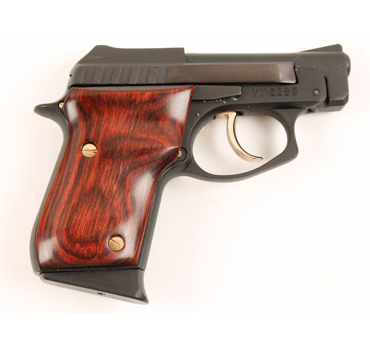 Blued and anodized double-action only semi-automatic pistol with one magazine, wood grips, 2-3/4" barrel and factory foam-lined box. Metal finish has only one mark on the front of the trigger guard. Has gold accents on screws, levers, mag catch and trigger. Bore is bright and shiny with strong rifling. Rosewood grips are unmarred. Action works well but Tight. Condition is very good.