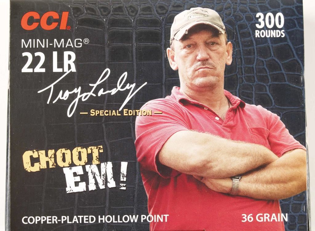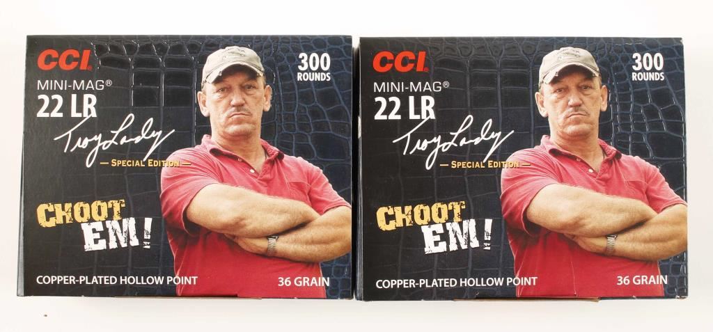 Two boxes of 300 round special edition CCI Mini-Mag copper-plated hollow point ammunition. "Choot Em!" edition featuring Troy Landry of History Channels "Swamp People". 36 grain bullets with the following specs from muzzle, 1260 fps velocity & 127 ft lbs energy.
