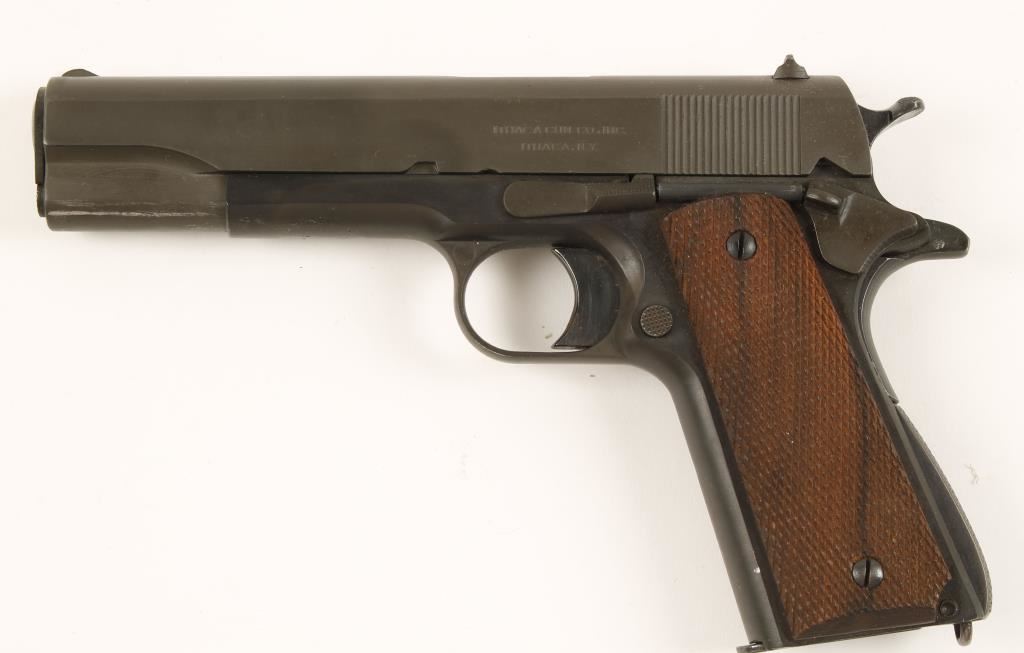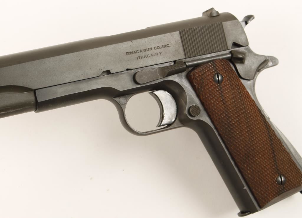 Blued steel Ithaca slide, arsenal replacement "779" barrel and black alloy frame with an applied serial number. Has early rounded spur checkered hammer, checkered bolt stop and serrated wide tab thumb safety. Trigger is smooth with no adjustments. Mainspring housing appears to be an Argentine Sistema 27 part. Bore is mirror bright with lots of rifling. Action and safety perform as designed. Grips are checkered wood in flawless condition. Condition is very good. *Modern Firearm*