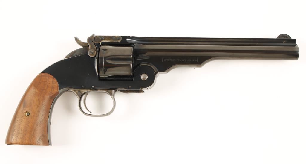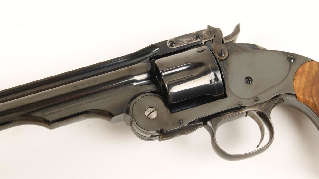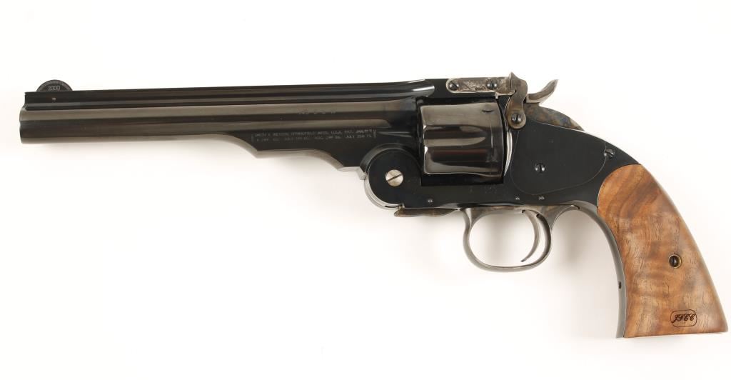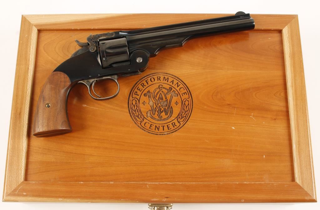 Smith & Wesson blued and case-colored 6-shot single action revolver with a 7" barrel, walnut grips and a S&W Performance Center foam lined display box. There is a drag line and some tiny dings in the back edge of the cylinder. Other than that the finish of the metal and wood is immaculate. The bore is bright and shiny as are the chambers. Action locks up very tightly. Condition is near new. *Modern Firearm*