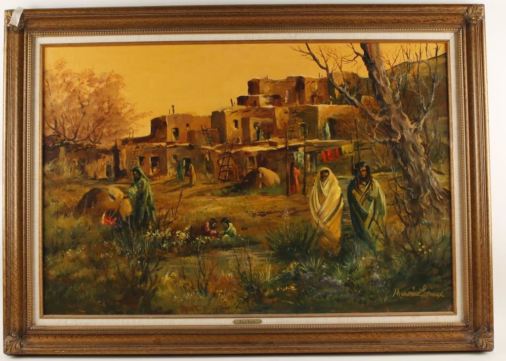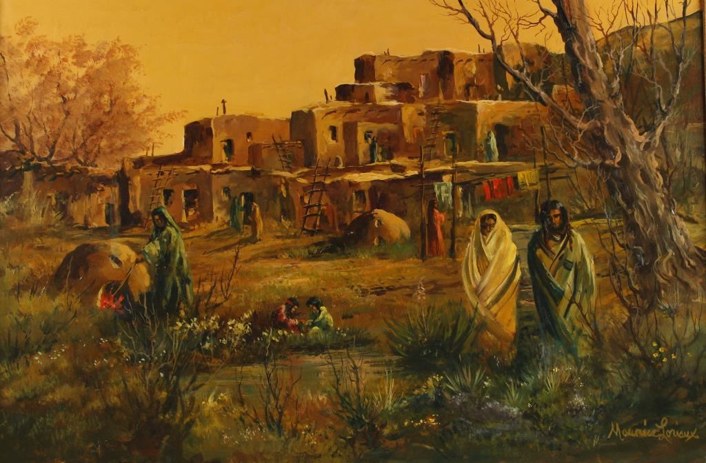 Maurice Loriaux artist entitled "Taos Pueblo". Hand signed lower right hand corner, original price $1750 in the 1970s. In gold rustic frame image measures 36"x23 1/2"
