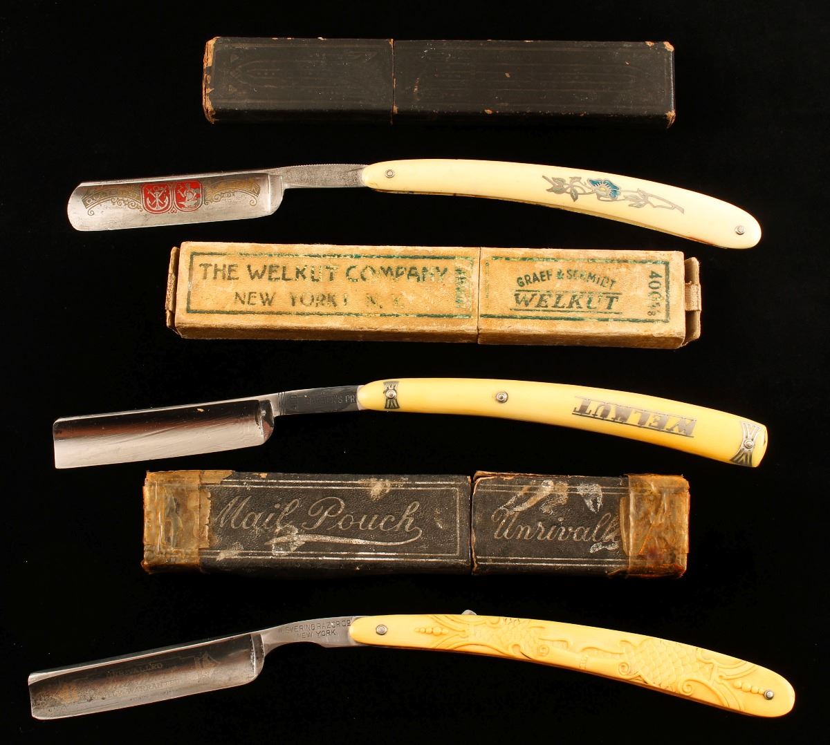 German Made blades with cases. Mail pouch Razor by Levering Company with embossed handle, Welcut Razor Company Barbers Pride.