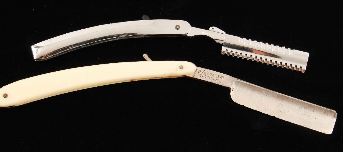 Including: (1) Stabil 31 5/8 Soligen Germany marked straight razor with white handle and etched blade. Blade has a few nicks but otherwise is in good condition. (1) Diane polished steel grooming razor. (1) Light brown leather sharpening strap. (1) U.S. pewter centennial mug. & (2) Shaving brushes from Made Rite and Mohawk. A nice collection of original shaving memorabilia.