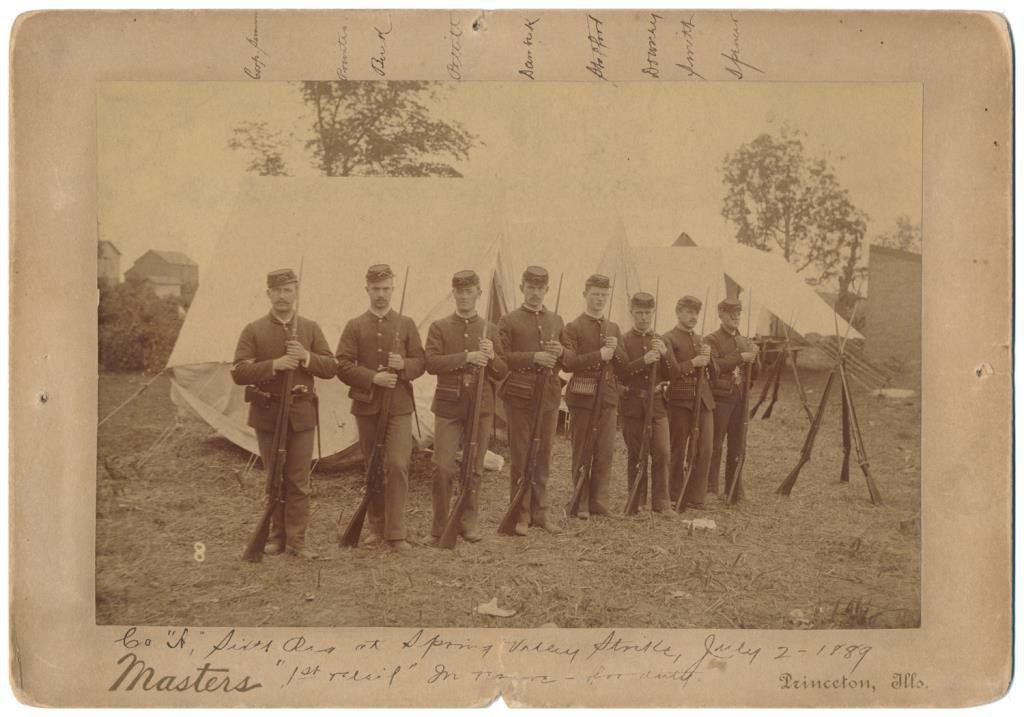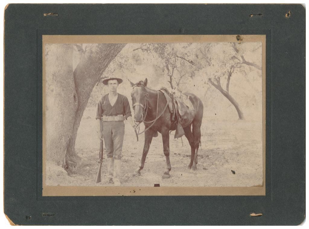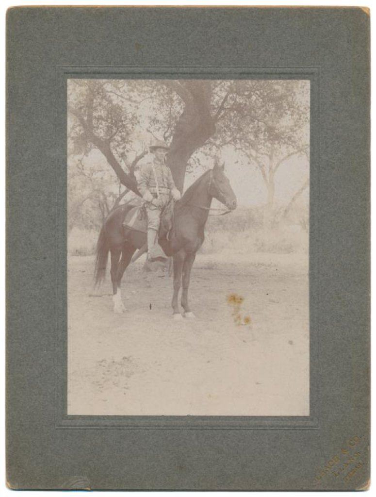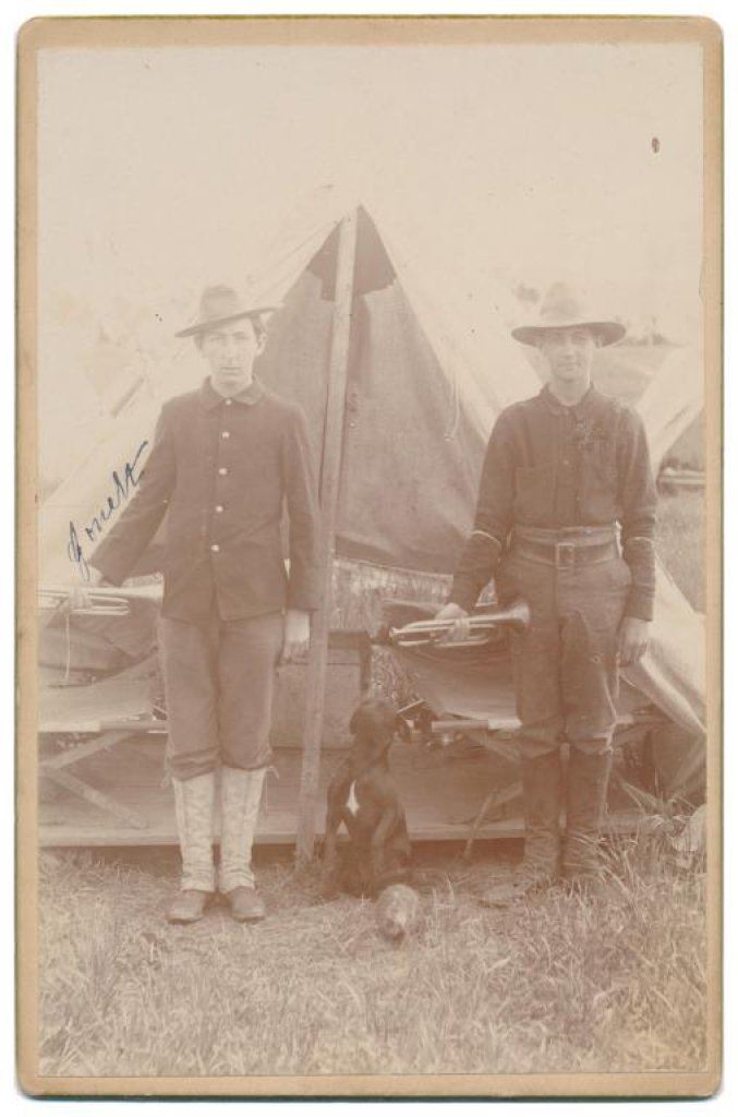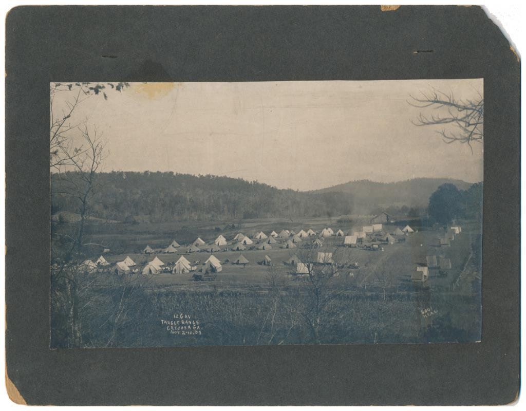 Lot of 16 misc. military cabinet photos, mostly of Spanish-American War era scenes and troops including a photo of two soldiers w/dog in front of tent and back handwritten: “For Grand Ma, Jonelt A. Wallace, Musician, Company G, Hoods Immunes, U.S.V.I., Santiago, De Cuba, American & Spanish War”; 4 photos of Calamba, Philippines with hand written notations on the back referencing locations and Troop A, 12th Cavalry; a cabinet photo marked “12 Cav. Target Range, Catoosa, GA, Nov. 2-10, ‘05”; 2 cabinet photos of soldiers in uniform with their horses; 3 cabinet photos of locations (unknown if Cuba or Philippines); a cabinet photo of 8 soldiers with U.S. Springfield trapdoor rifles and id of soldiers plus notation “Co. “A”, Sixth Reg. at Spring Valley, ILL., July 2, 1889”; a cabinet photo of troopers in front of barracks by J. W. Hanna & Co., Cherokee, Texas; cabinet photo of cannon salute on parade grounds; another of mounted troops on parade grounds; and a photo by Stone & DeGroff of Colonel Geo. P. Gross, 3rd Reg Inf., U.S.V. A great lot of early military photos from the late 1800’s-early 1900’s. Est.: $250-$500.