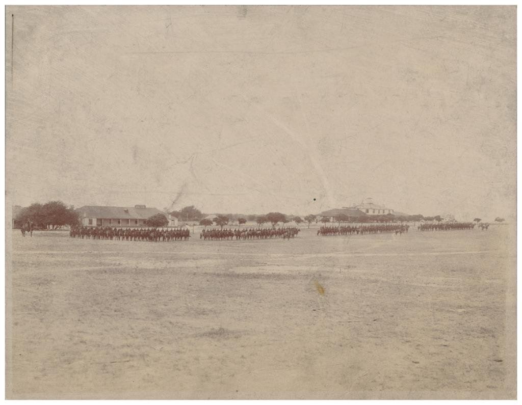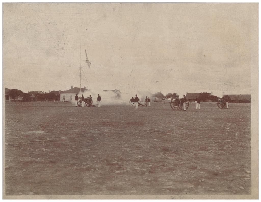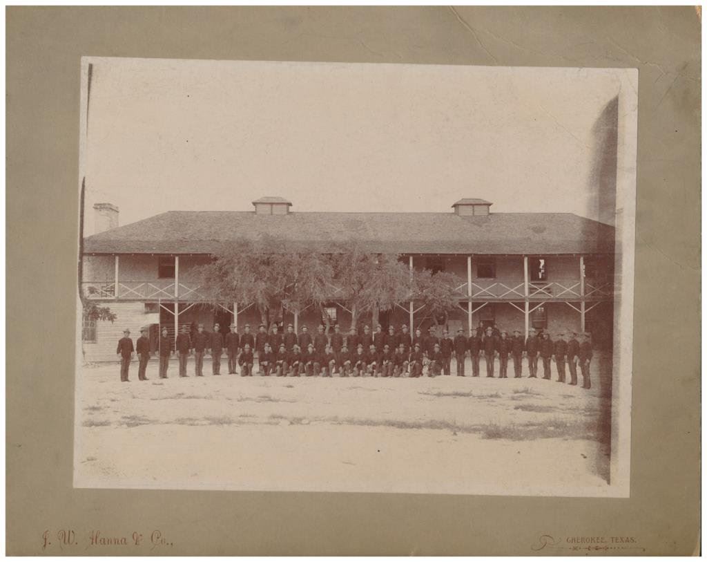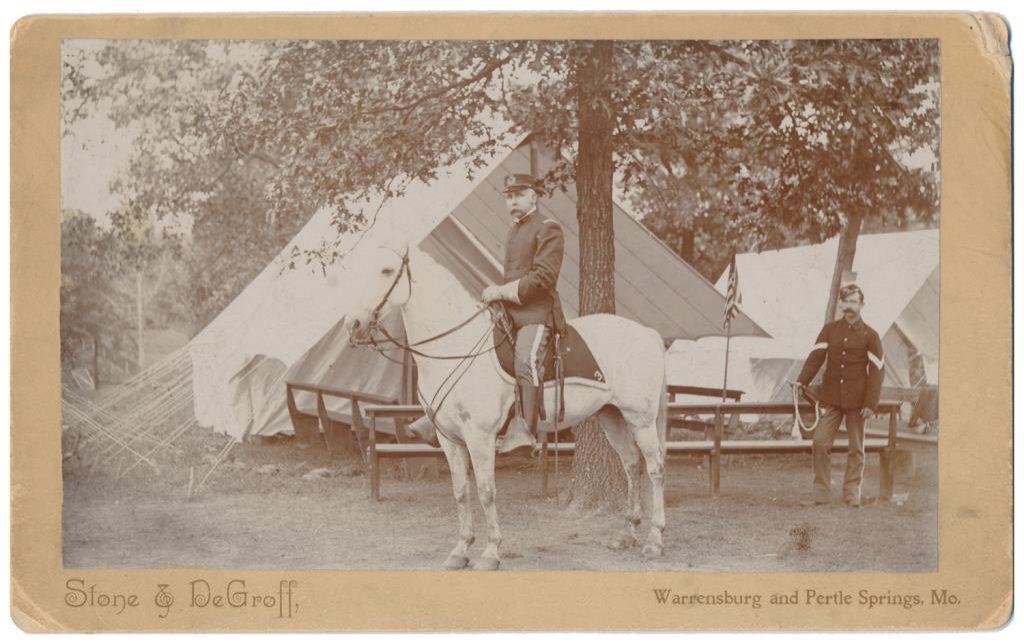 Lot of 16 misc. military cabinet photos, mostly of Spanish-American War era scenes and troops including a photo of two soldiers w/dog in front of tent and back handwritten: “For Grand Ma, Jonelt A. Wallace, Musician, Company G, Hoods Immunes, U.S.V.I., Santiago, De Cuba, American & Spanish War”; 4 photos of Calamba, Philippines with hand written notations on the back referencing locations and Troop A, 12th Cavalry; a cabinet photo marked “12 Cav. Target Range, Catoosa, GA, Nov. 2-10, ‘05”; 2 cabinet photos of soldiers in uniform with their horses; 3 cabinet photos of locations (unknown if Cuba or Philippines); a cabinet photo of 8 soldiers with U.S. Springfield trapdoor rifles and id of soldiers plus notation “Co. “A”, Sixth Reg. at Spring Valley, ILL., July 2, 1889”; a cabinet photo of troopers in front of barracks by J. W. Hanna & Co., Cherokee, Texas; cabinet photo of cannon salute on parade grounds; another of mounted troops on parade grounds; and a photo by Stone & DeGroff of Colonel Geo. P. Gross, 3rd Reg Inf., U.S.V. A great lot of early military photos from the late 1800’s-early 1900’s. Est.: $250-$500.