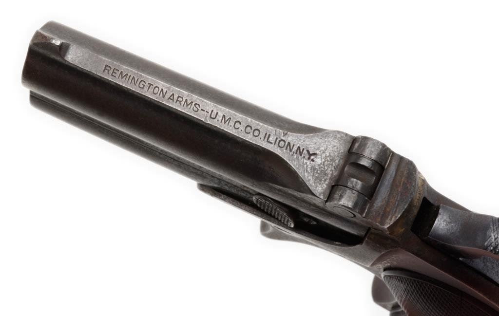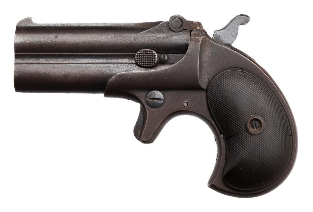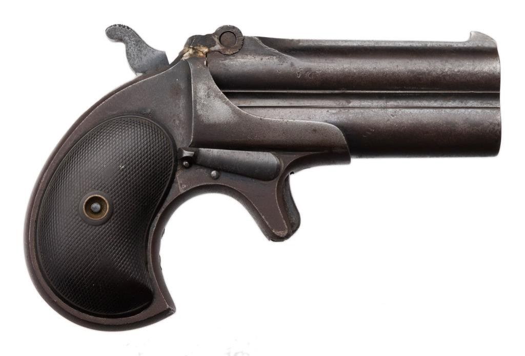 Remington O/U derringer, .41 caliber, 3” barrels, S/N 94, blued finish, checkered hard rubber grips. This gun is in overall fair condition showing traces of original blue mixed with brown patina. The action is functioning but the firing pin is missing; the top frame hinge has been repaired, the bores are dirty but may clean to good; the right grip is good; the left grip shows an old crack from the forward side to the grip screw escutcheon. Est.: $250-$350.