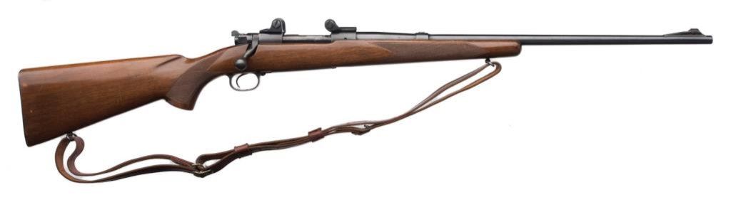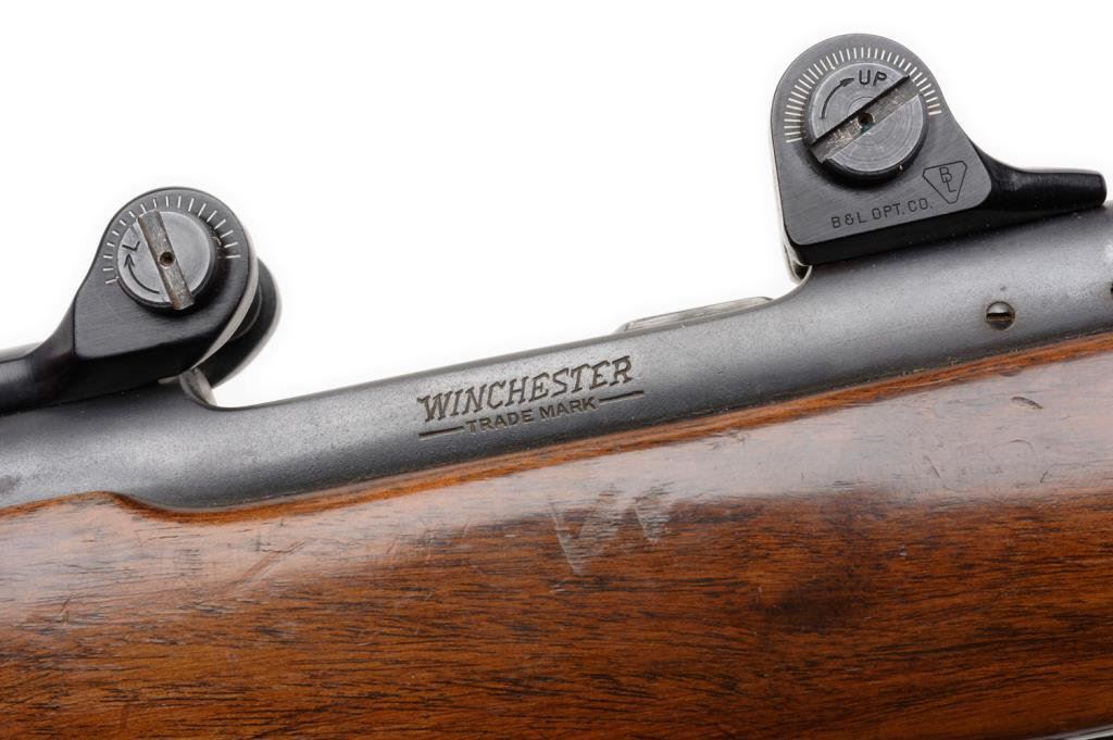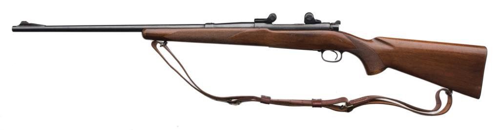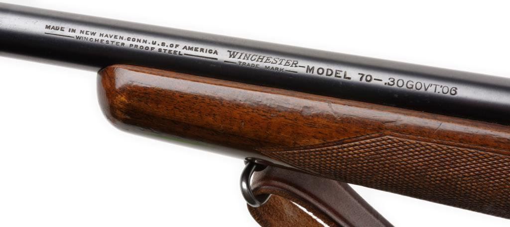* Winchester Model 70 bolt action rifle, 30/06 cal., serial #47876. The rifle is in overall very good condition with a 24” blued barrel. The barrel and receiver retain the majority of their blued finish with some loss of finish and surface rust present on the magazine base plate. The ramp front sight remains, while the rear sight has been removed and the dovetail filled with a plug. The checkered wood stock is in overall very good condition with some small mars, compressions and scrapes consistent with field use. The rifle ends with a checkered steel butt plate showing significant blue finish and includes a period leather sling. The rifle is topped with Bausch and Lomb adjustable proprietary scope mounts. The bore is good, the action is crisp and markings sharp. Manufactured in 1942, this Model 70 remains a classic manufactured during the second world war. Est.: $600-$1,200.
