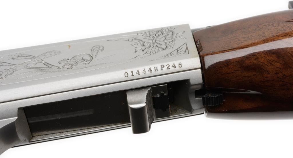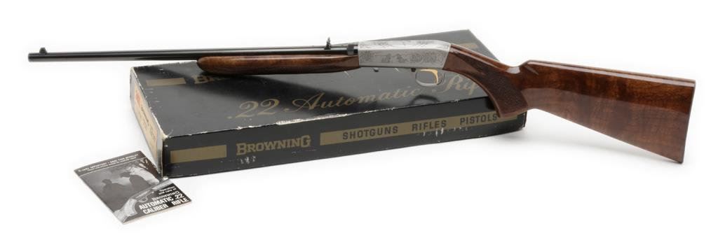 ++Browning Grade II semi-automatic rifle, .22LR caliber, 19” barrel, S/N 01444RP246, blued finish to barrel, engraved receiver, checkered wood butt stock and forend, in factory cardboard box with insert, instructions and end label numbered to this gun. This Browning is in overall like new condition showing little use or handling. Est.: $400-$800.