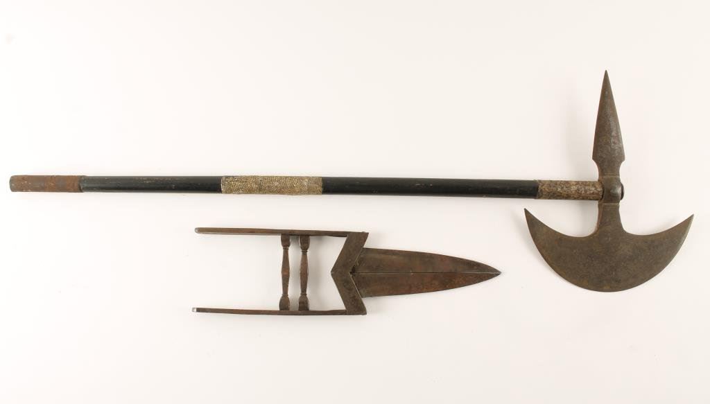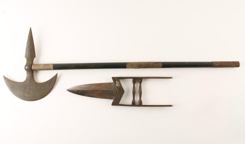 Lot of 2 collectible bladed weapons including a 19th to 20th Century mid-eastern scissor Qatar dagger with silver inlay, approximately 14.5” overall and in good condition with minor spots of light surface rust that will clean plus a 19th to 20th Century Indo-Persian battle axe with snake skin wrapping on wood shaft, overall approximately 32.5” long and displaying silver inlay work on the axe head; dark patina; overall fair-to-good condition. Est.: $250-$500.