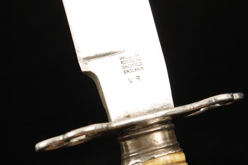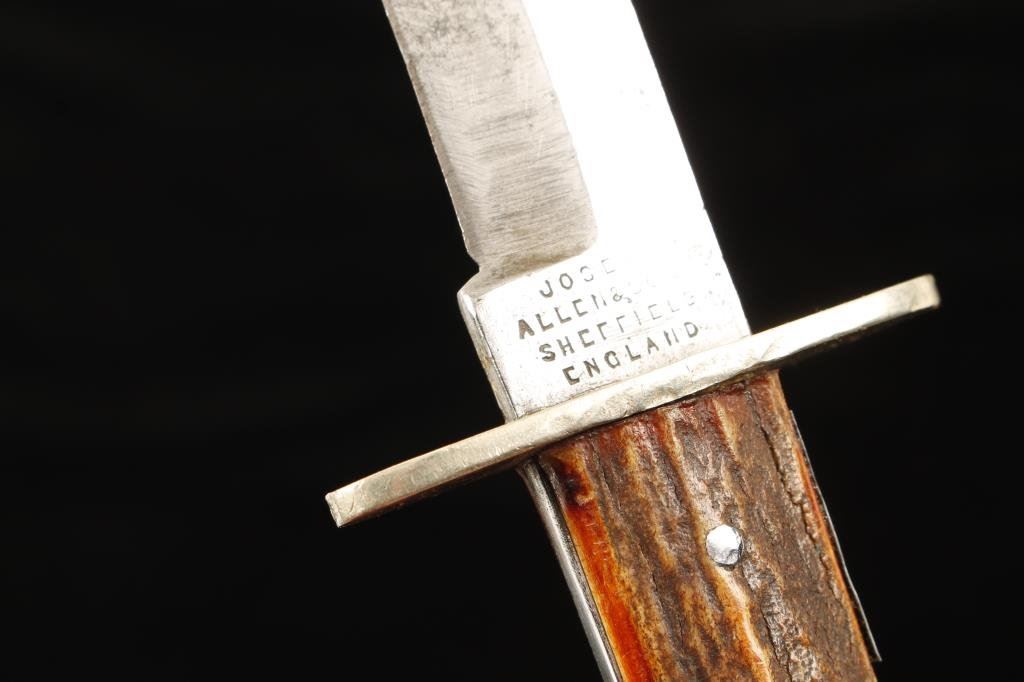 Lot of 2 collector knives including a clip point “NON*XLL”-marked knife with stag slab grip by Joseph Allen & Son, Sheffield, England, approximately 9.75” overall with a 5.75” blade in overall good condition; also a clip point knife with checkered bone grip, approximately 11” overall with a 6.25” blade marked “William Rogers, Sheffield, England” and with a “V.R.” additional mark, both on ricasso; overall condition is very good +. Est.: $200-$400.