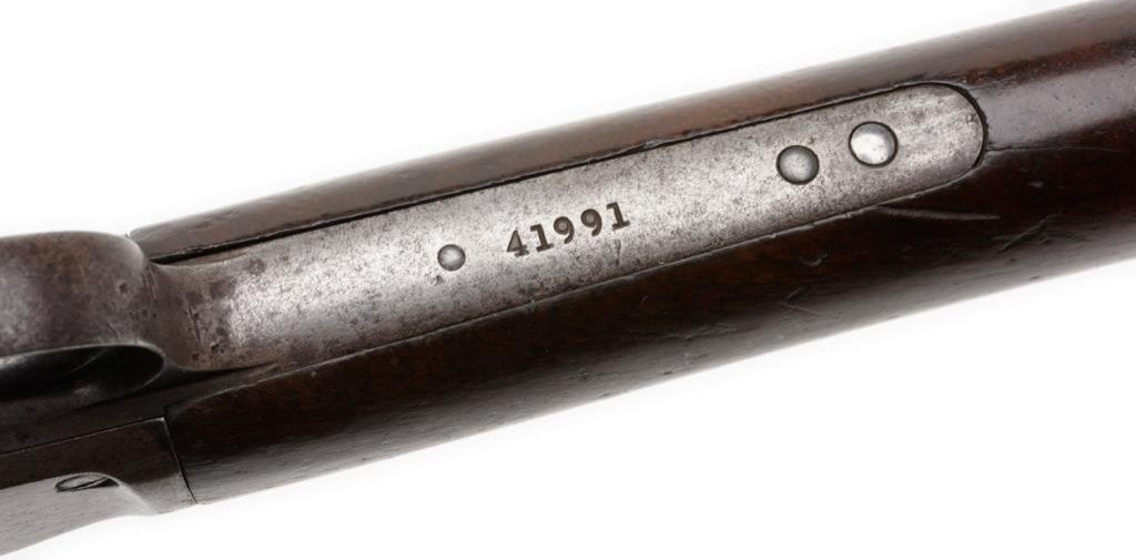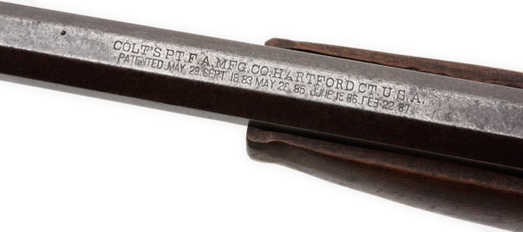 **Small frame Colt Lightning pump action rifle, .22 caliber, 24” octagon barrel, S/N 41991, blued finish, wood stocks with correct Rampant Colt checkered hard rubber butt plate. This Colt rifle is in overall good to very good condition displaying a dark patina to metal surfaces, good action and markings, dark bore, very good wood stocks with scattered old mars to the butt stock which was re-finished long ago. Est.: $500-$1,000.