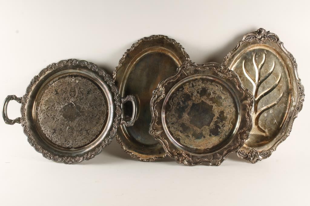 Lot 418 Lot of 4 silver plated serving trays including one fancy oval tray, approx