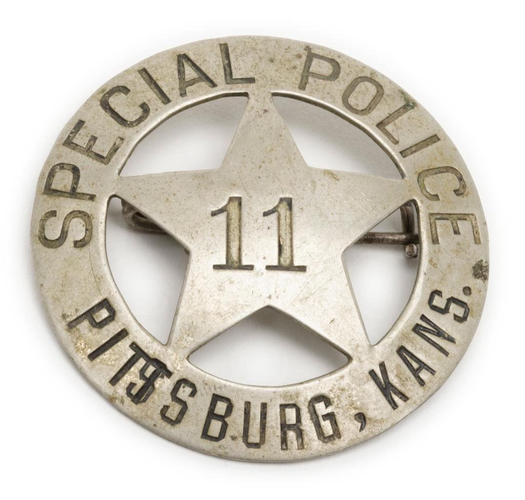 Old Special Police #11 Pittsburg, Kans. badge in overall very good condition; nice patina, no maker marks on reverse. Est.: $200-$300.