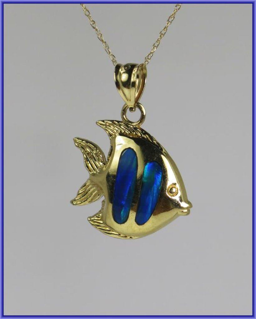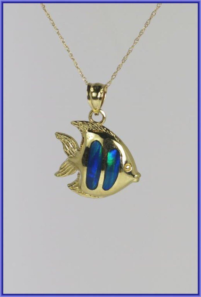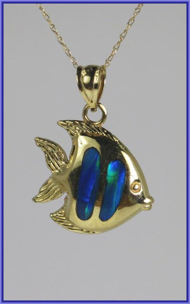 Vibrant Opal Fish Pendant with beautiful color flashes of blue and green opal inlay set in an artistic design made of 14 karat yellow gold. Retail $500-$700 Estimate $300-$400
