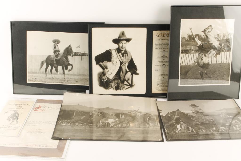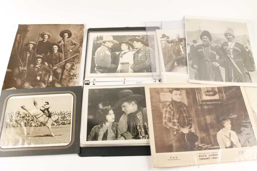 Great large lot of approx. 47 Western and Hollywood film-related advertising photos and documents including a framed photo of a cowboy performer for the Bijou Academy event of Feb. 1916 (with program flyer); 2 framed photos of performing cowgirls (ca 1930’s); a letter on San Joaquin Valley Rodeo letterhead dated April 21, 1927 and brochure for that year’s Rodeo Benefit; 5 misc. Rodeo photos including several large (approx. 11” x 14”); 5 Rodeo photos from the 1946 Winnemucca, NV event; 2 early Buck Jones Movie advertisers; a 1930’s photo of Western Star Montie Montana; a 14” x 11” sepia tone photocopy of 5 cowboys with armament including Winchester, Marlin and Colt Lightning rifles; a photo of Frank & Bonnie McCarroll, Wild West performers, ca 1924 and a 3-ring binder of 28 publicity photos of early motion pictures and advertising shots related to Western cowboy and actor Buck Jones with cover letter on Buck Jones Wild West Shows & Round-Up Days letterhead, signed by his grandson Bucklind Noah Beery, noting the photos came from his grandfather’s collection. A superb lot of Western photo and paper goodies! Est.: $500-$1,000.
