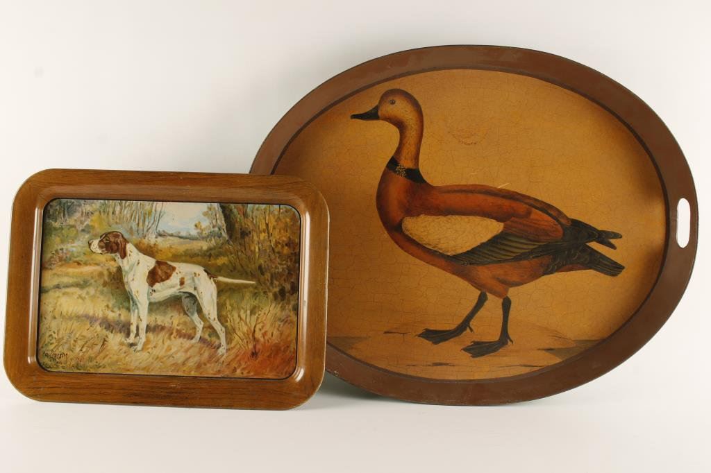 Large metal oval serving tray, approx. 26” x 20” x 2” with painted duck in bottom of tray; nicely accomplished. Est.: $50-$75.