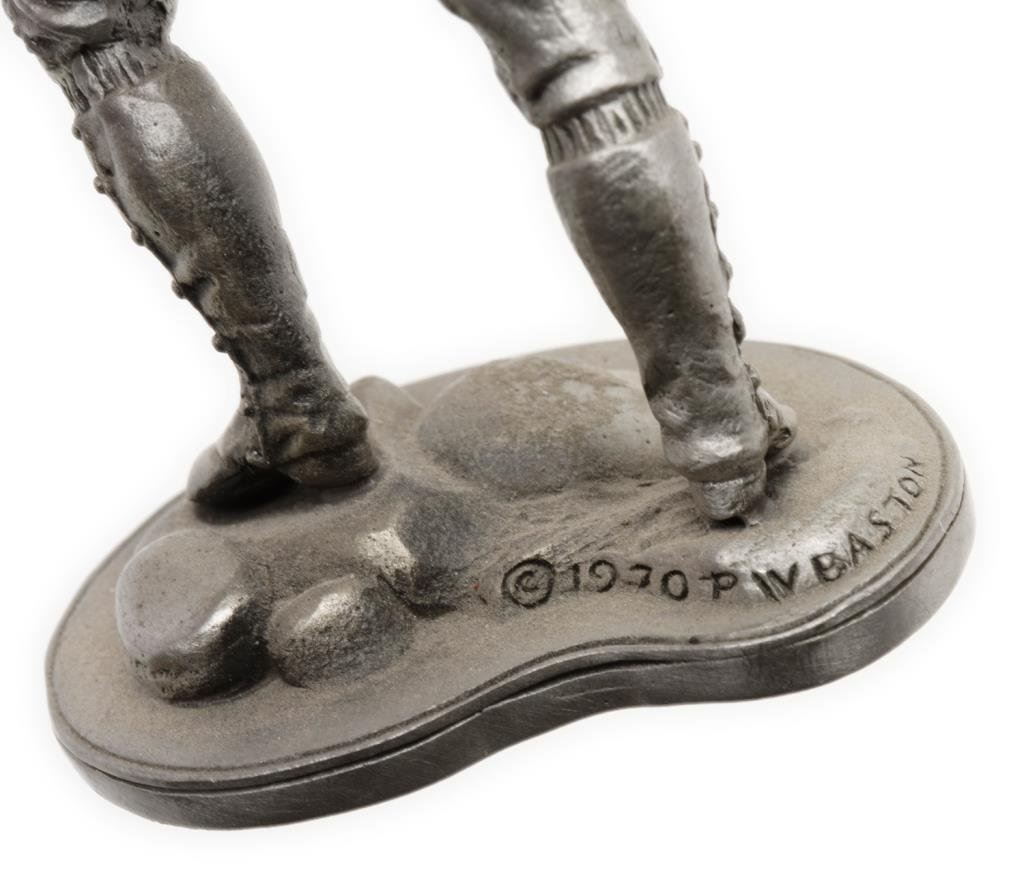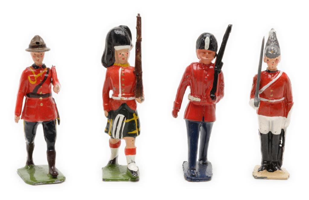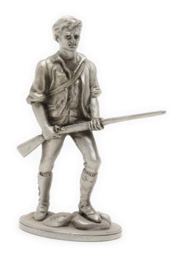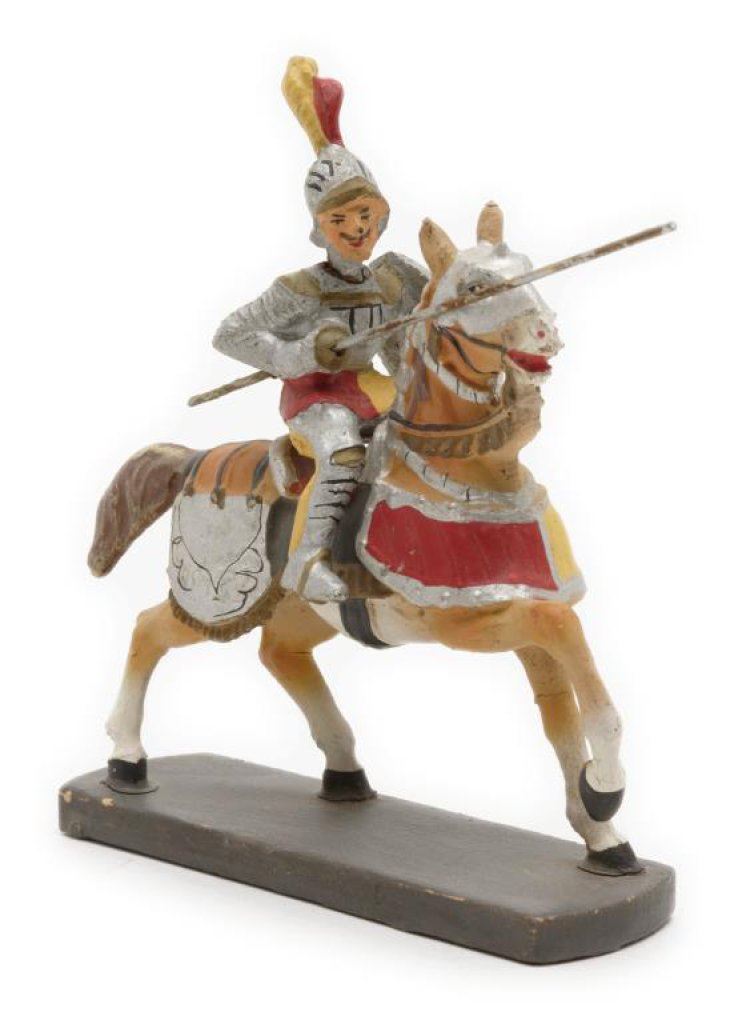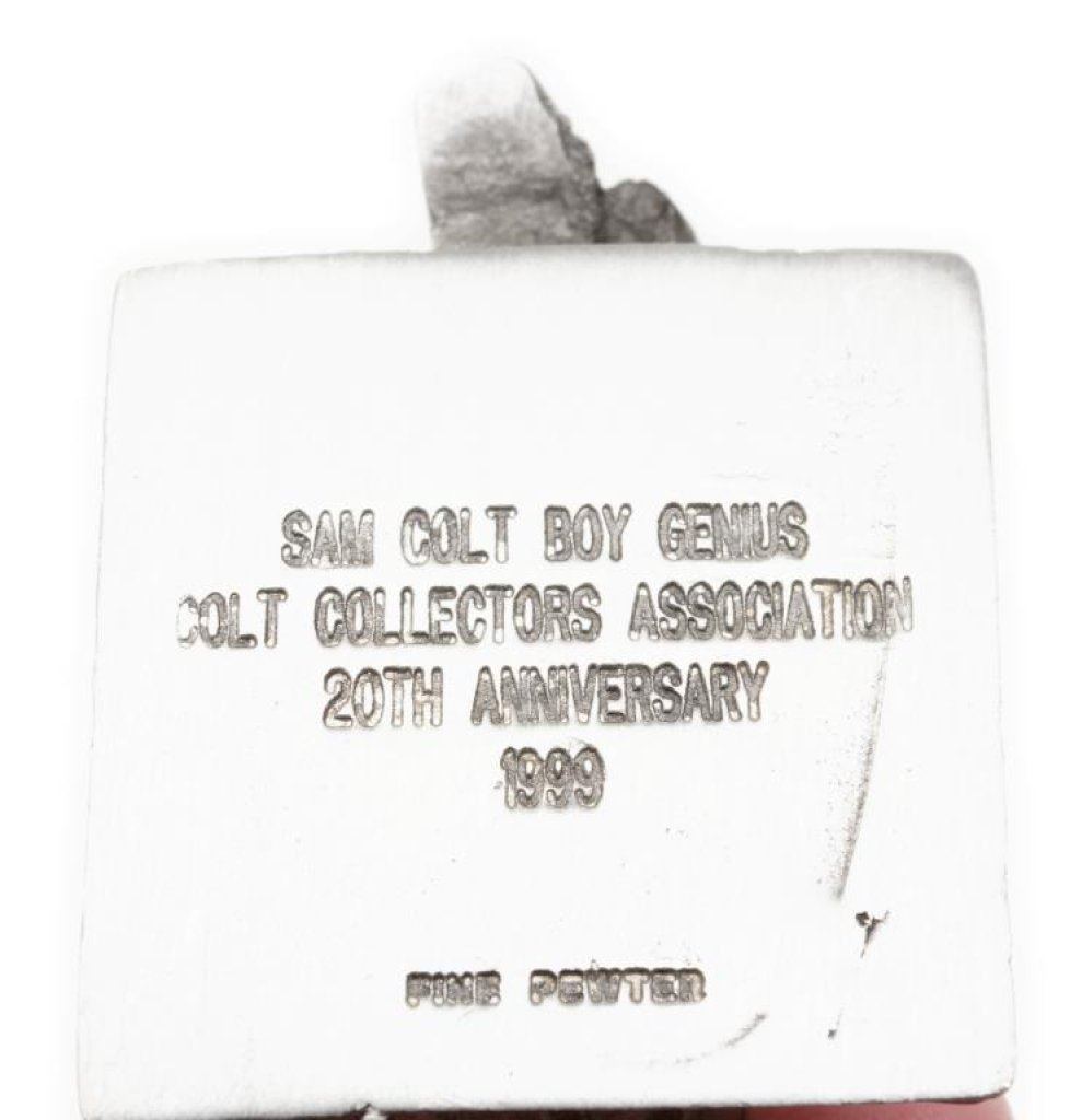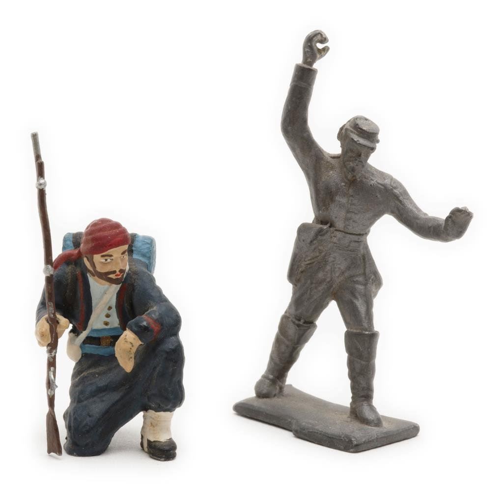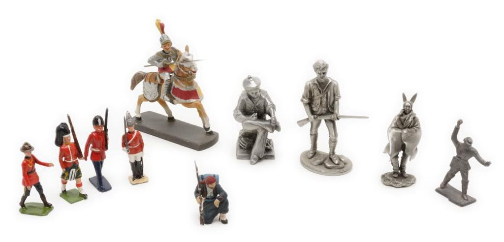 Lot of 10 early toy metal figures including various soldiers, a knight on horseback, a mountie and 3 pewter figures including the likeness of Samuel Colt as a “boy genius” showing him carving parts of what would become the first practical revolver. Est.: $75-$125.
