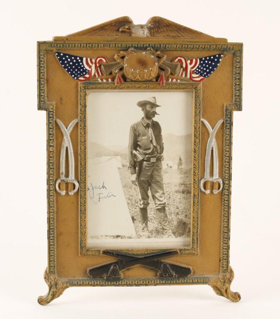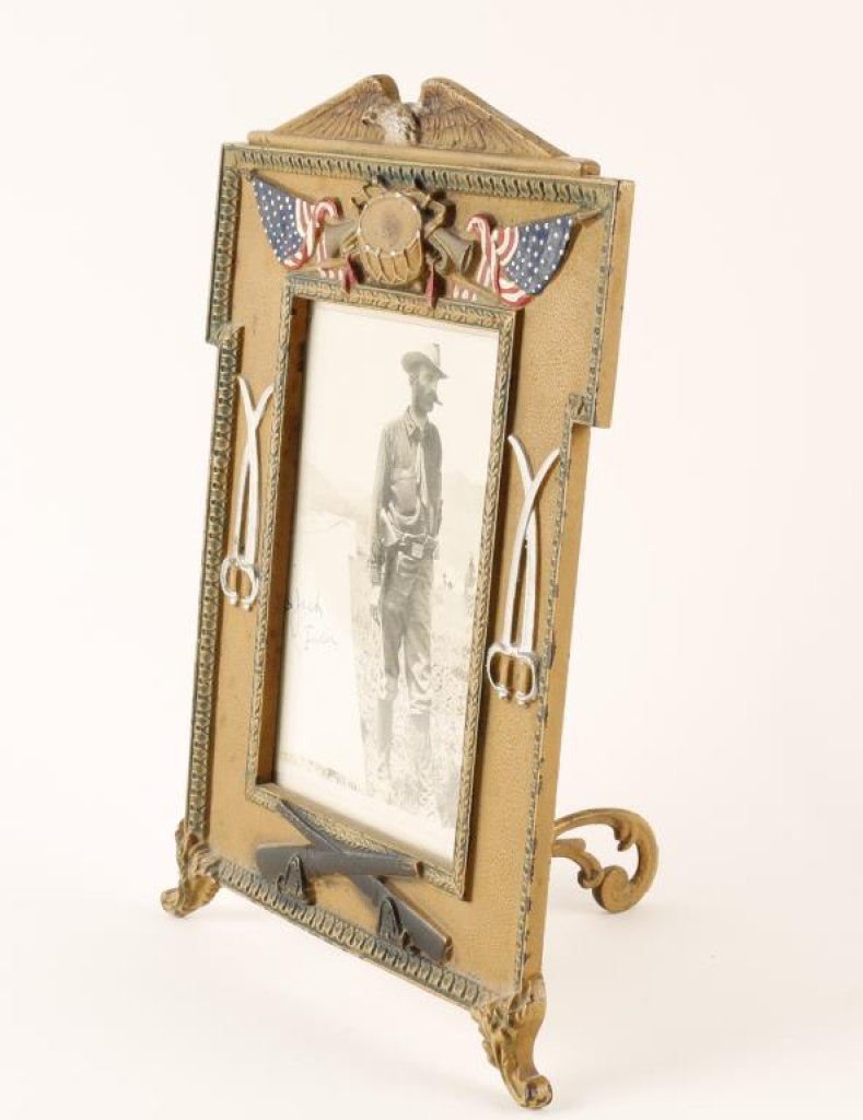 Patriotic metal picture frame (ca 1890-1916), approximately 9.5” x 6.5” overall with the majority of its original paint and with a photo of a uniformed U.S. soldier in the field next to a small tent with other soldier and tents in background. Est.: $50-$75.