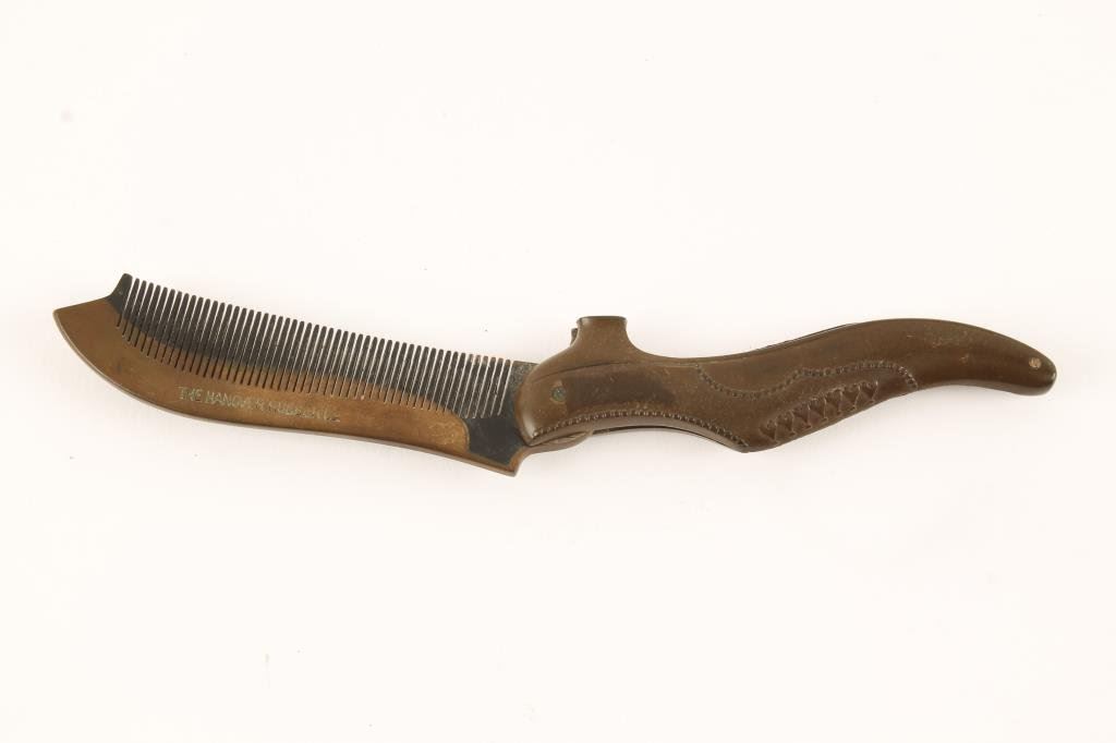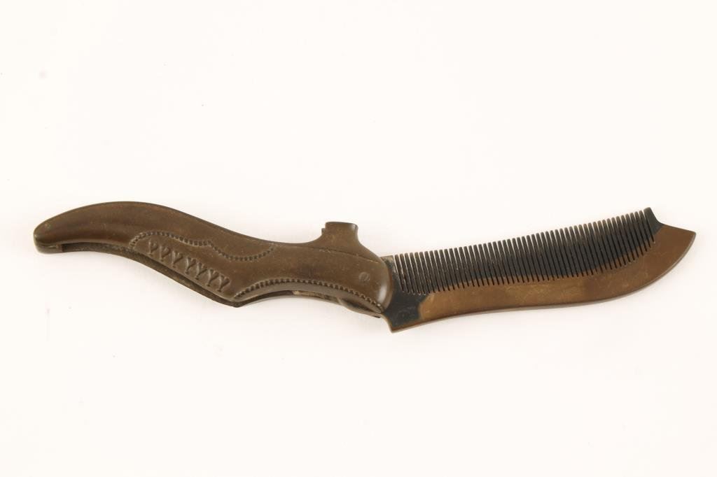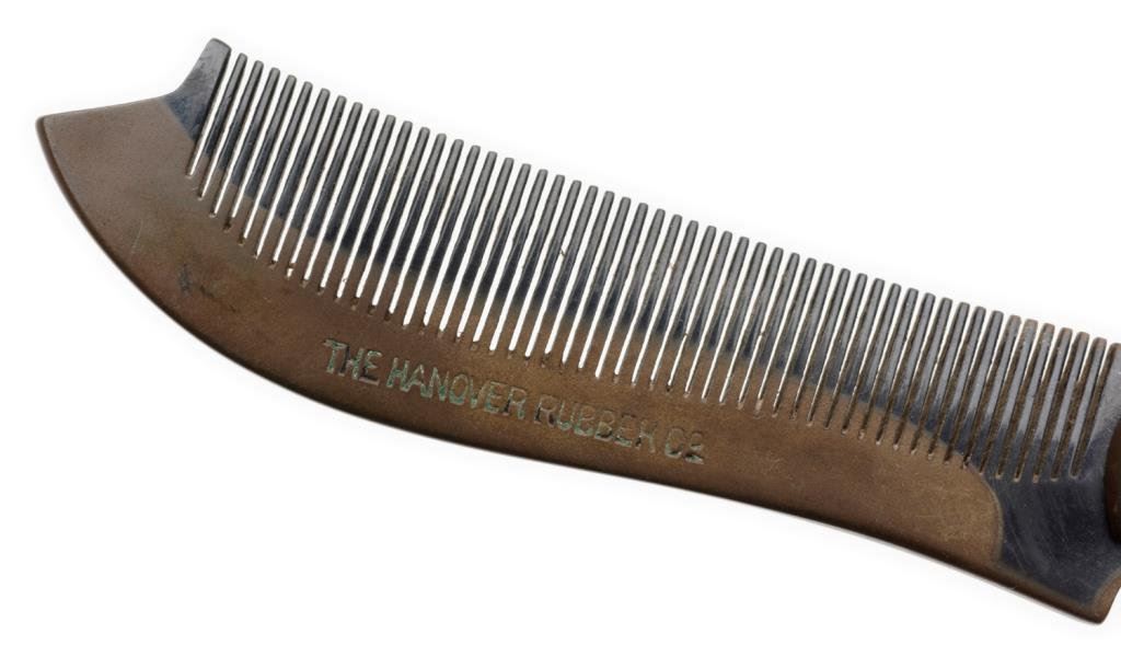Great antique advertiser moustache comb in shape of a shoe, approximately 3.25” overall closed and made of gutta percha material; marked “The Hanover Rubber Co.” and in overall very good to fine condition. Est.: $50-$100.