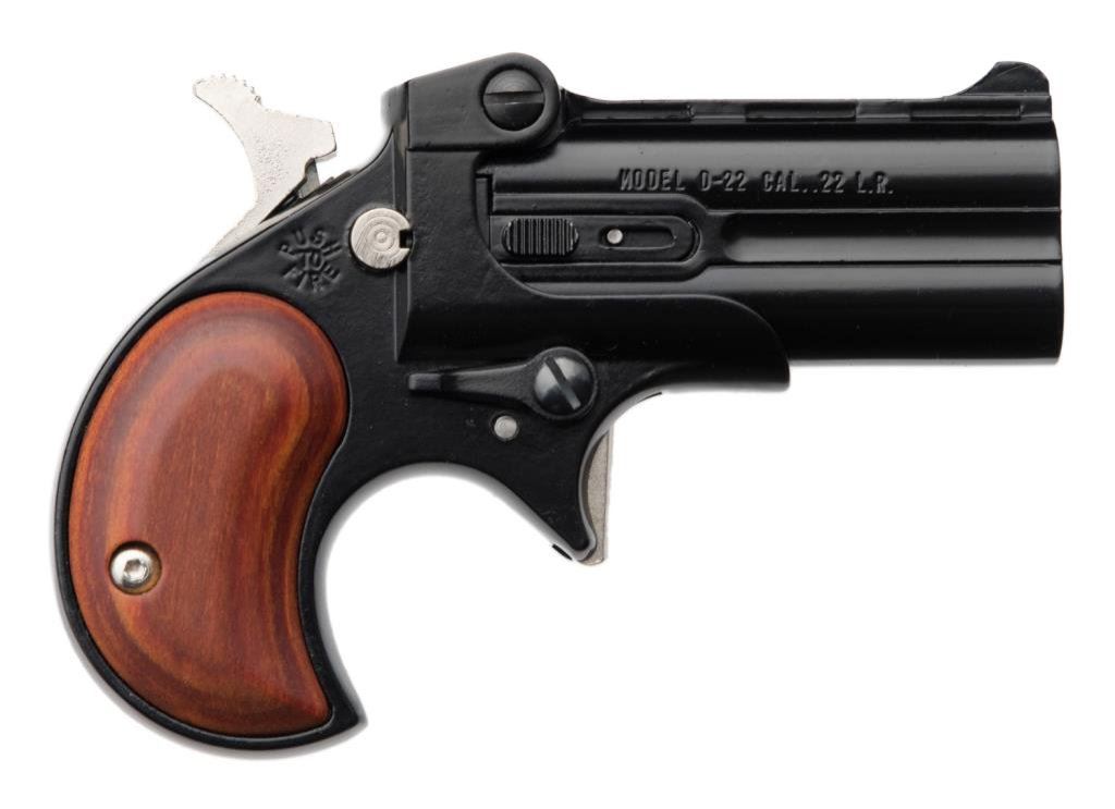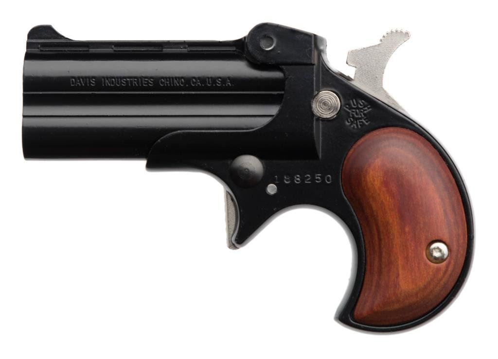 **Davis Industries Model D-22 Derringer pistol, .22 LR caliber with 2 ¼” barrels, S/N 188250. The pistol is as new in box with all of the original black finish, excellent bores and smooth wood grips. The pistol retains the original factory box and paperwork. Est.: $100-$200.