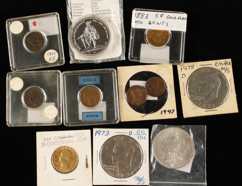 Lot of collector coins (all ungraded) including a 24K gold plated Bi-Centennial Washington Quarter; a 1978-D Eisenhower dollar; a 1985 Swiss Shootingtaler Commemorative coin; an 1881-S Morgan Silver Dollar; a 1973-D Eisenhower Silver Dollar; an unusual 1883 Liberty 5 cent piece without the “Cents” marking and gold plated; a 1921-S, and 2-1947 Lincoln pennies; a 1901 Indian Head penny and an 1897 Indian Head Penny. Est.: $75-$150.