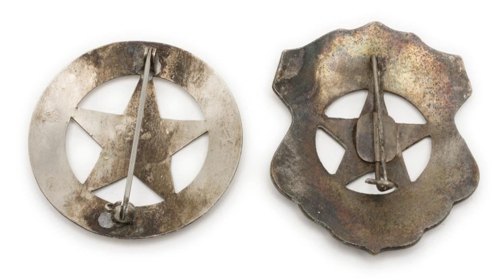 Lot of 2 old badges; one is an 8-point star marked Deputy U.S. Marshal with a nice patina and no maker’s mark on the reverse; the other is a cut out shield marked United States Marshal Arizona Territory with a nice patina and no maker’s mark on the reverse. Purchased by consignor in the 1970’s. Est.: $200-$300.