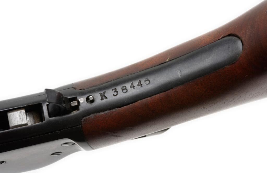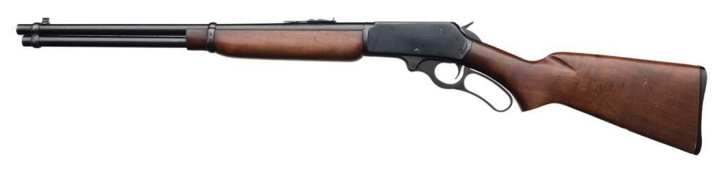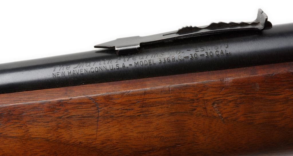 **Early Marlin Model 336RC lever action carbine, .30-30 caliber, 20” round barrel, S/N K38446, blued finish, thick wood forend and wood butt stock. This carbine is in overall fine condition showing the majority of its original finish; fine bore, action, markings and wood stocks. Est.: $300-$600.