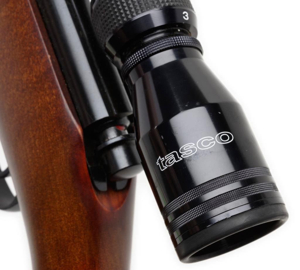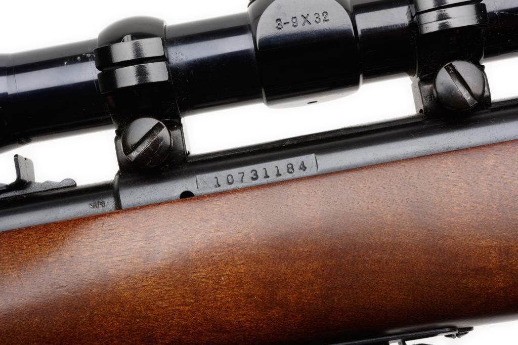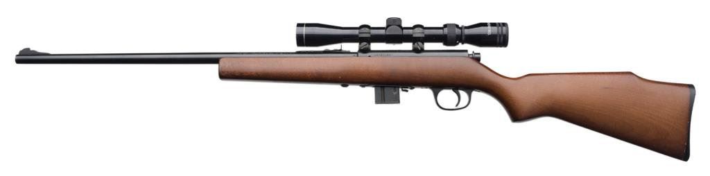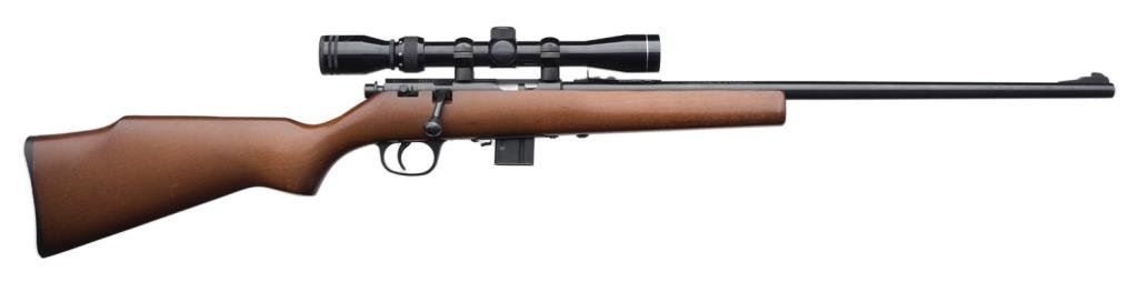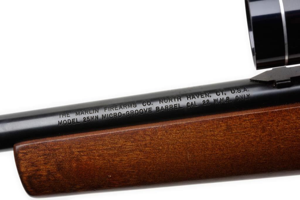 **Marlin Model 25MN bolt action rifle, .22 WMR caliber, serial #10731184. The rifle is in overall fine condition with a 22” blued barrel with a ramp front and adjustable rear sights. The barrel And action retain nearly all of their blued finish with only minor wear at the muzzle. The smooth wood stock is in overall very good condition showing only small mars from handling and storage. The stock ends with a hard rubber, Marlin marked butt plate. The bore is very good, action crisp and markings sharp on this rifle. The rifle comes with a Tasco 3x9x32 variable power scope and one magazine. Est.: $250-$500.