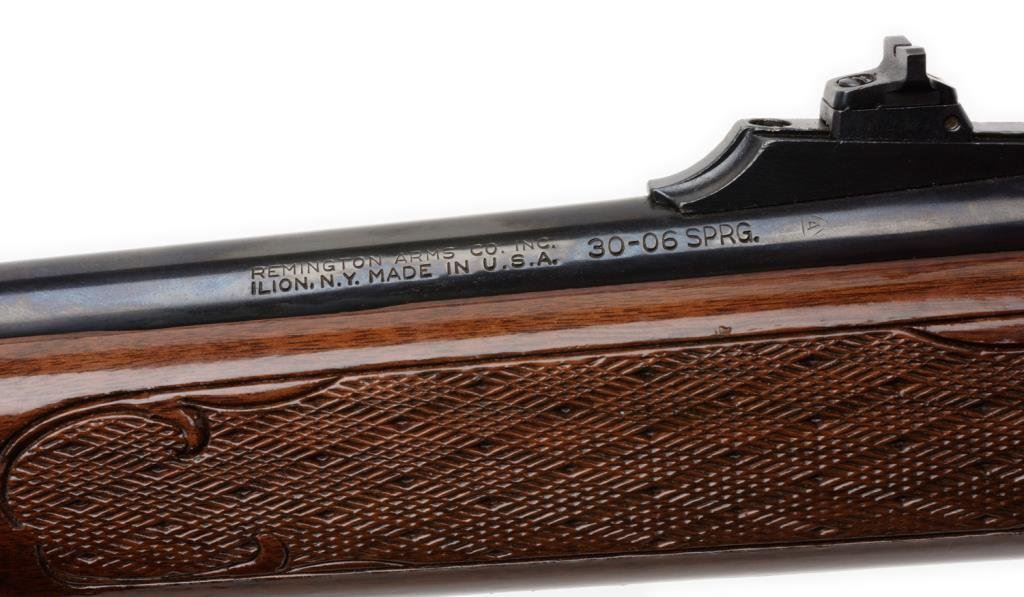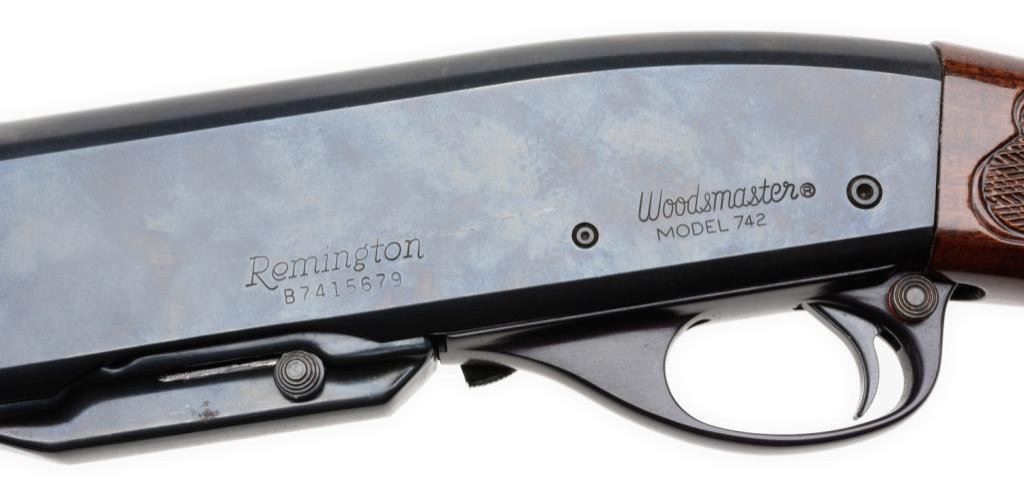 **Remington Woodmaster Model 742 semi-automatic carbine, .30/06 caliber, serial #B7415679. The carbine is in overall very good condition with a 19” blued barrel with a ramp front and adjustable rear sights. The barrel and action retain the majority of their blued finish while the top of the receiver has been drilled and tapped for mounts. The checkered wood stock is in overall very good to nearly fine condition showing only slight handling marks. The stock features sling swivel studs and a black plastic Remington marked butt plate. The bore is very good, action crisp and markings sharp. Est.: $350-$700.