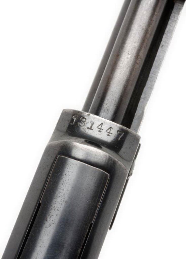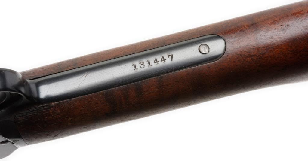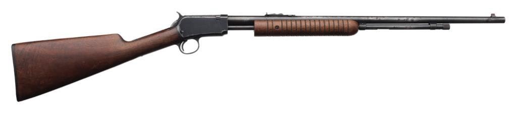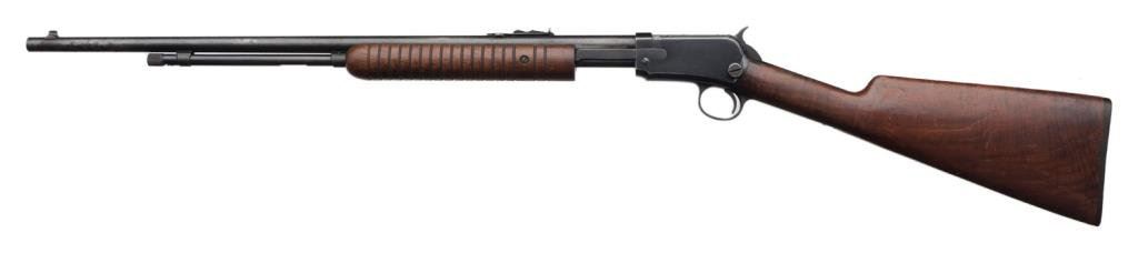 **Winchester Model 62A pump action rifle, .22 short, long or LR caliber, 23” round barrel, S/N 131447, blued finish, wood stocks in overall good to very good condition showing the majority of its original finish on the frame and areas of muted original finish on the barrel with some scattered areas of erosion and pinprick pitting that have been cleaned; very good bore, crisp action, sharp markings and very good wood with correct Winchester checkered black hard rubber butt plate. Est.: $350-$550.