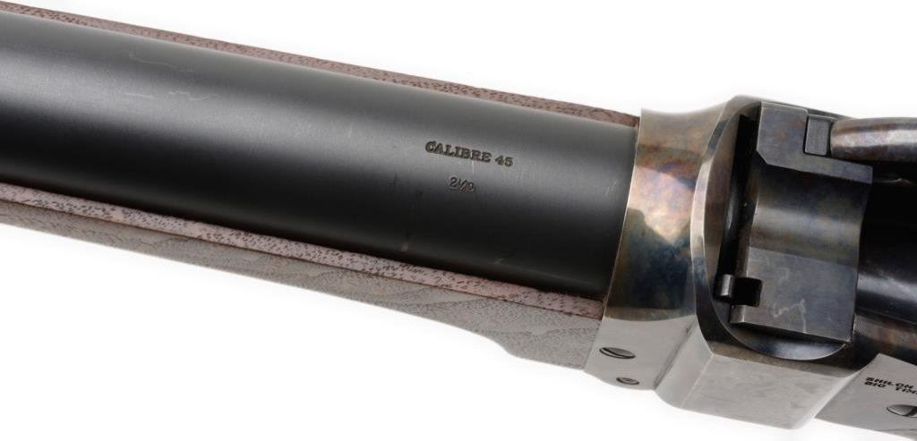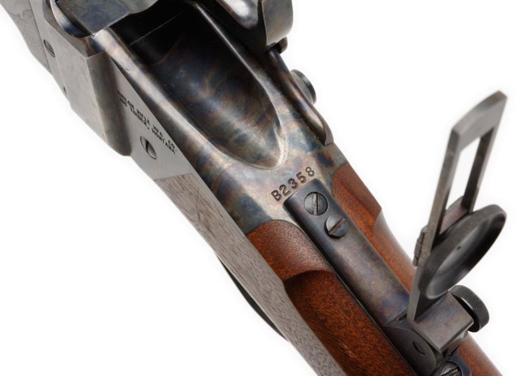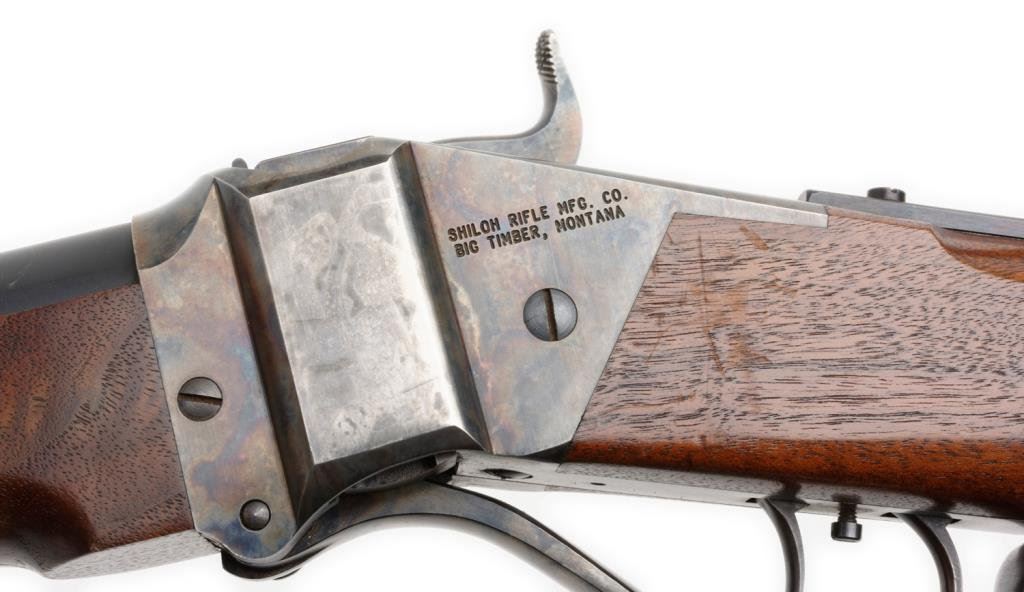 *Modern Shiloh Sharps Model 1874 single shot rifle, .45 2-1/10” caliber, 28” heavy round barrel, S/N B2358, mat black and case hardened finish, double set triggers, adjustable tang peep sight and hooded front sight; wood stocks. This rifle is in fine condition displaying the majority of its original finish, fine bore, action, markings and wood. Est.: $800-$1,600.