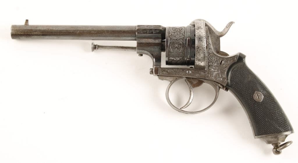 Engraved European Pinfire Revolver, 9mm caliber, 5.75” barrel, S/N 15331. Blued finish, checkered ebony grips, lanyard ring. This gun is in overall very good to fine condition showing the majority of its original blue finish on the barrel assembly and cylinder with the frame gone to a silver tone. The action is crisp, the engraving deep and in a floral style. The bore is good and the checkered grips are overall very good with some old mars confined to the left grip. Est:$600-1,200