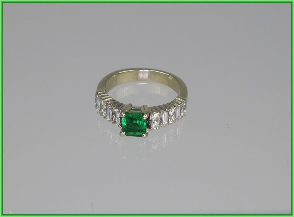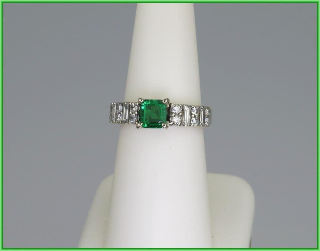 Luxurious FINE Emerald and Diamond Ring featuring approx. 0.85 square cut emerald with wonderful rich green color and good clarity with 4 baguettes and 12 brilliant round cut Diamonds weighing approx. 1.00 carat total all with E-G colors and VVS/VS clarity set in 14 karat white gold. Wonderful Piece. Retail $3,000-$3,500 Estimate $1,800-$2,000
