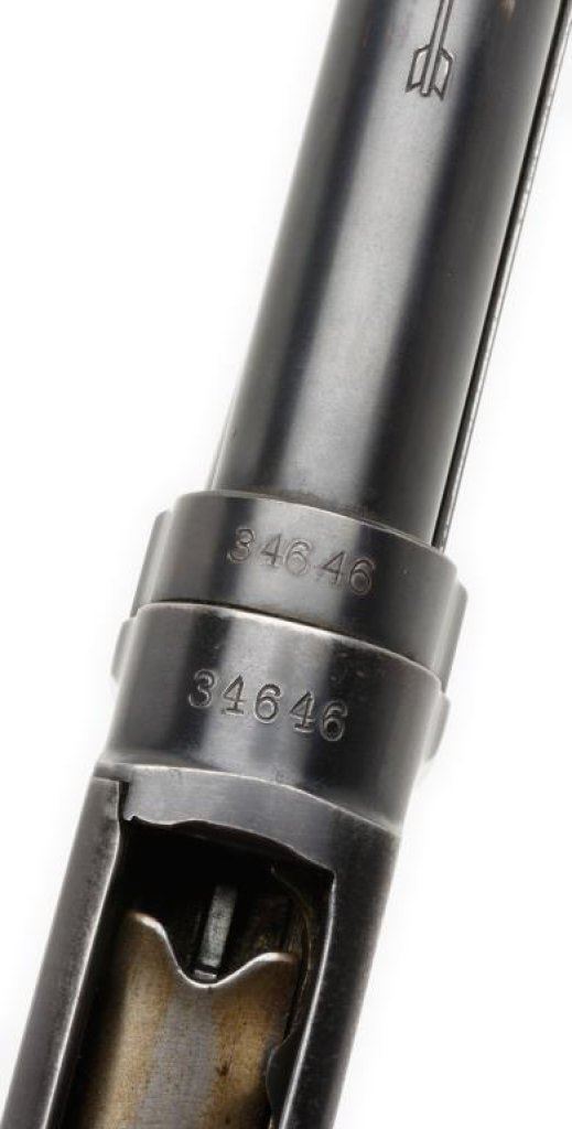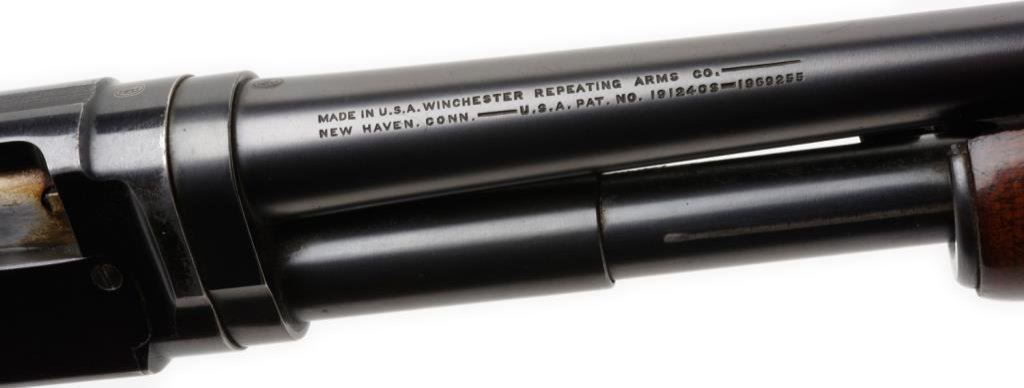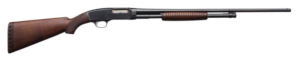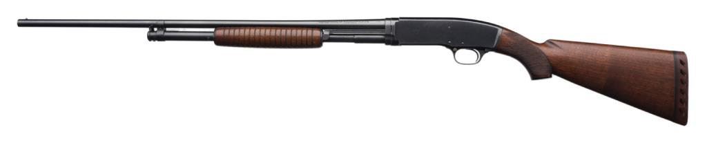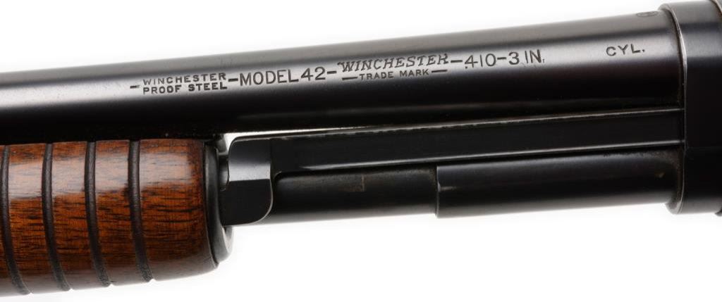**Winchester Model 42 pump action takedown shotgun, .410 gauge, 3” chamber, Cylinder choke, 26” barrel, S/N 34646, blued finish, checkered semi-pistol grip butt stock with added red hard rubber butt pad. This early Model 42 (ca late 1938) is in overall fine to excellent condition showing the majority of its original blue finish, fine bore, crisp action, sharp markings and overall fine wood. Est.: $1,000-$2,000.