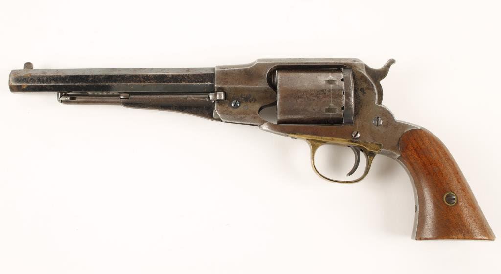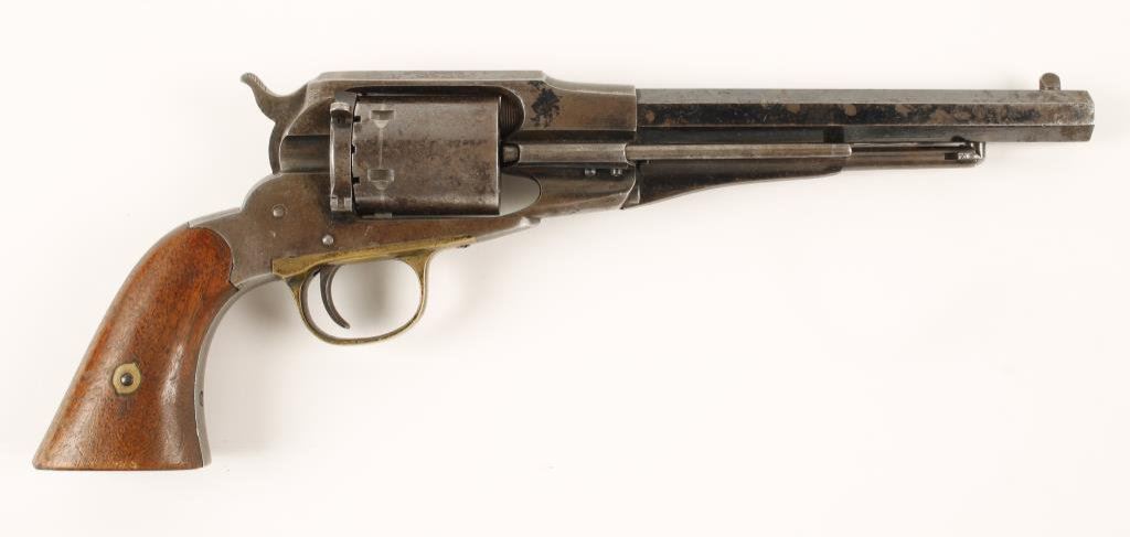 Remington 1858 New Model Conversion .38 RF caliber, 7.5" octagonal barrel, S/N 40557 (conversion number 658). Blued finish, wood grips. Condition: This revolver is in overall very good + condition showing considerable original blue finish on the barrel and loading lever. The frame and cylinder also display areas of original blue finish remaining. The action is crisp, the markings are sharp, the bore good and the grips very good +. The brass triggerguard has a pleasing dark patina. EST.: $1500-$3000