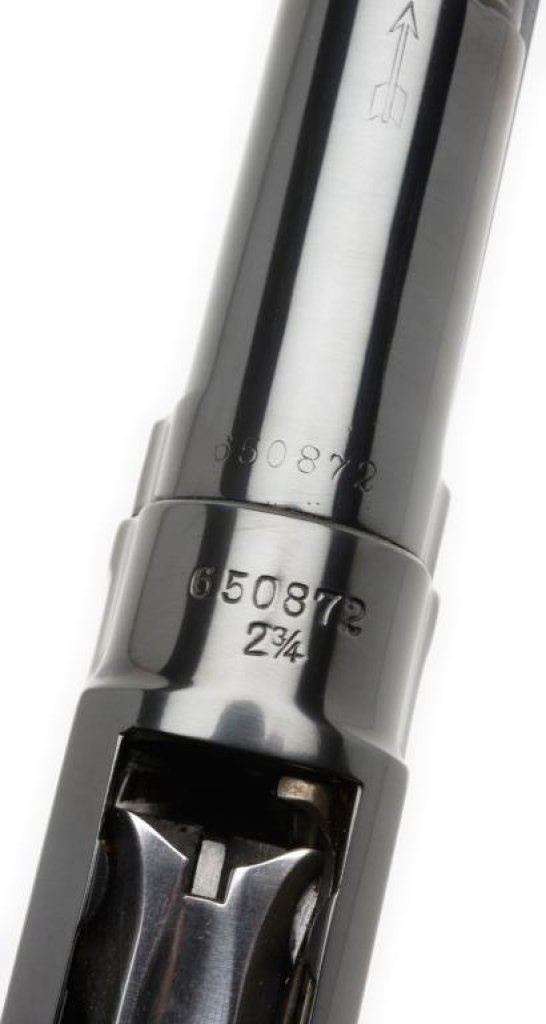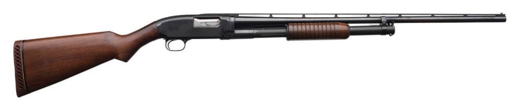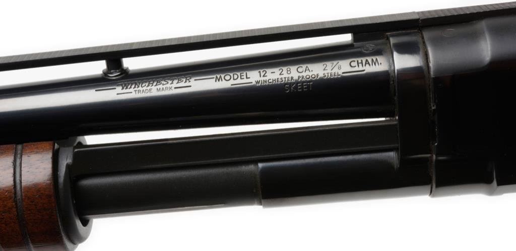 **Winchester Model 12 pump action takedown shotgun, .28 gauge, Skeet choke, 26.5” ventilated rib barrel, S/N 650872, blued finish, wood stocks with added red hard rubber butt pad. This gun is in overall excellent condition showing the majority of its bright blue finish, mirror bore, crisp action and markings, overall very good to fine wood with some old scattered mars to the butt stock from storage. Est.: $1,750-$2,750.