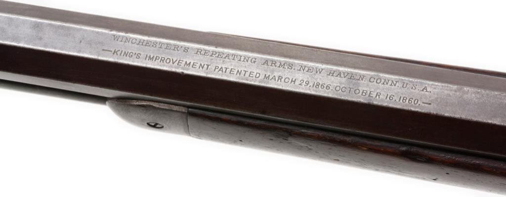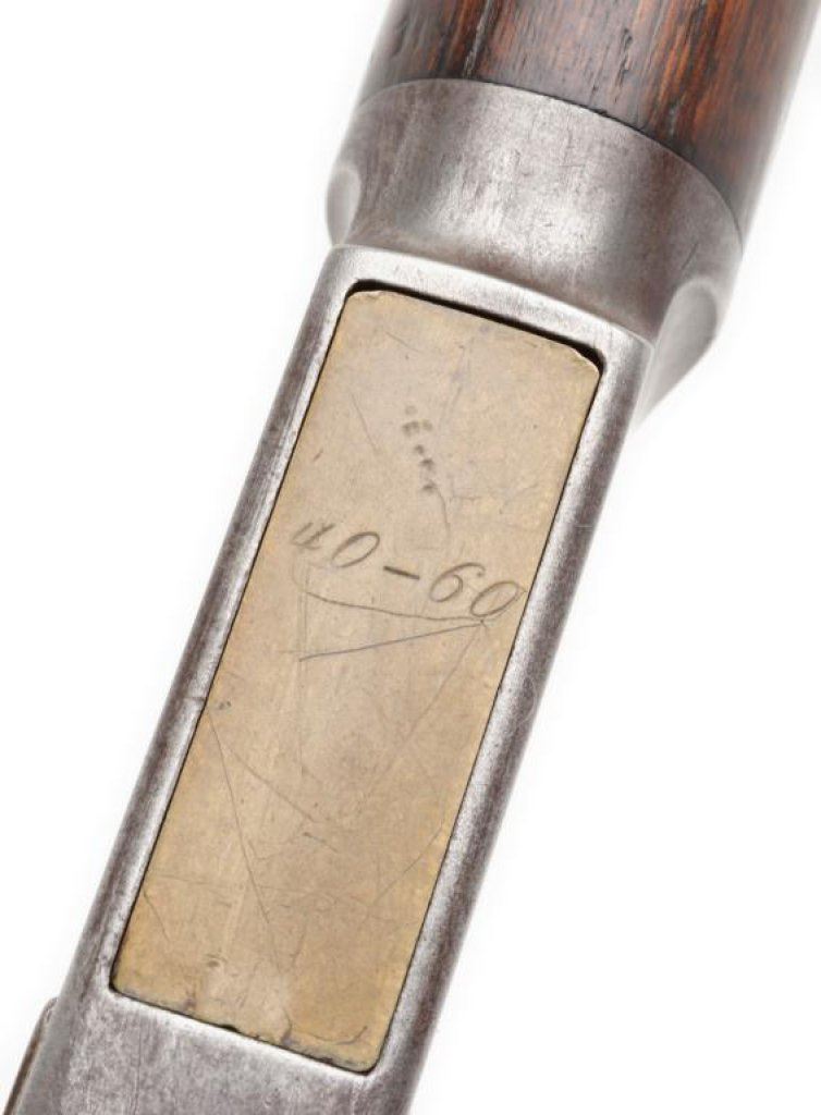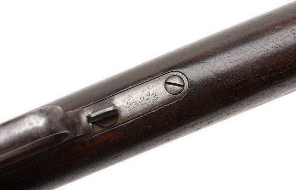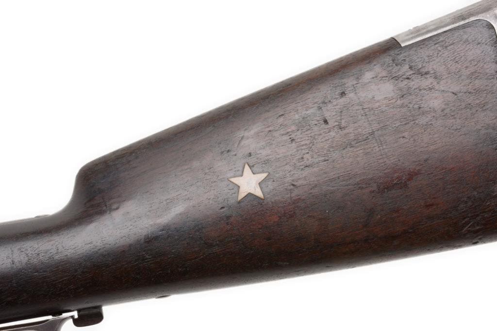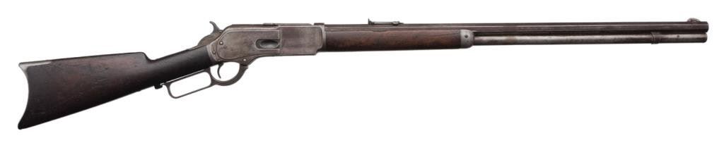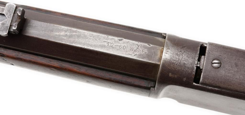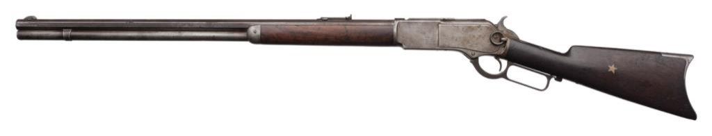 Interesting Winchester Model 1876 lever action saddle ring carbine, .40-60 caliber with a 28” octagon barrel (confirmed by factory letter!), S/N 54594, blued finish, wood stocks in overall good to very good condition displaying a dark patina to metal surfaces; overall good bore, crisp action, very good markings, replaced old blade insert in front sight; good wood stocks showing weathering and scattered old mars and scratches from carry and storage; also an old period inlaid brass 5-point star on left side of stock. Original factory letter confirms features and indicates received in warehouse on July 29, 1886 and shipped on November 16, 1886 to order number 12271. Est.: $2,500-$5,000.