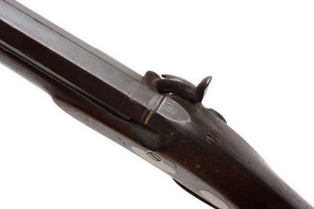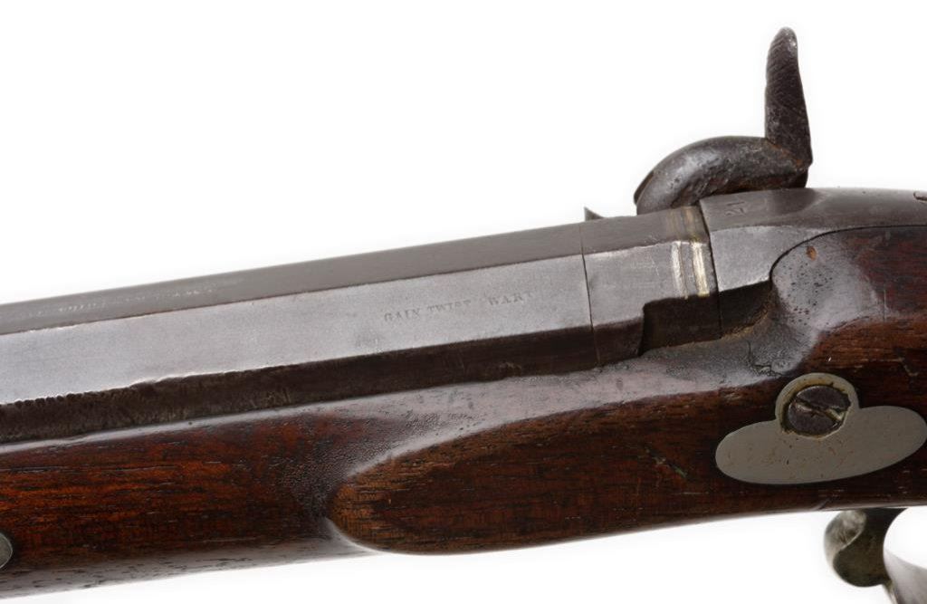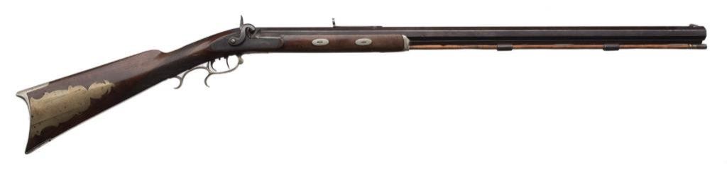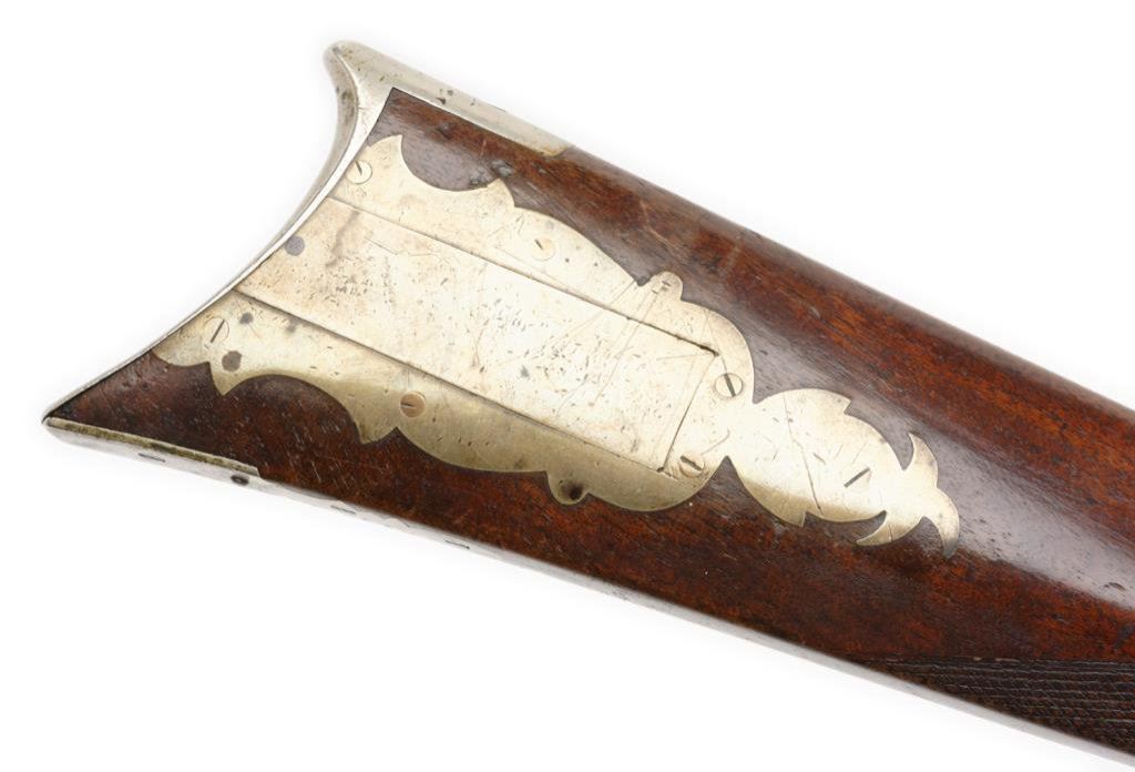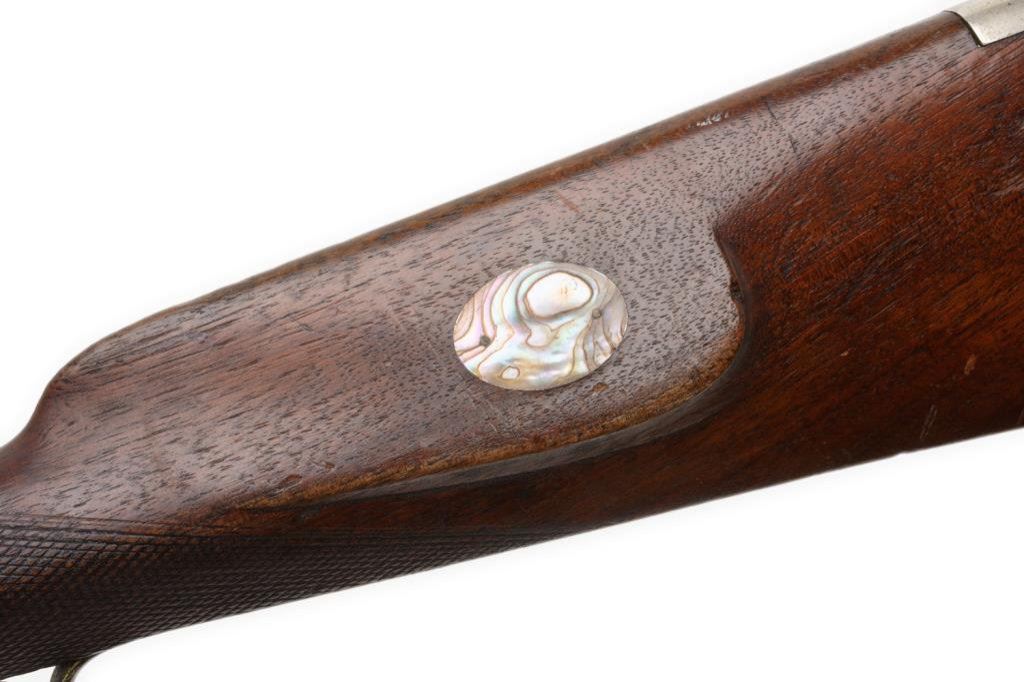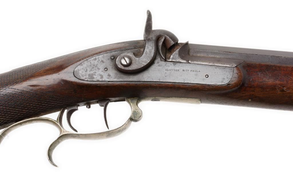 Slotter percussion double keyed half stock plains rifle, .45 caliber, 32” octagon barrel marked “SLOTTER & Co./PHILa/MADE FOR J.BACH/SAN FRANCISCO”, ca 1860; coin or nickel silver mounts with an abalone inlay in the cheekpiece; double set triggers working at time of description; brown patina overall, very good checkered wood stock. Est.: $3,000-$6,000.