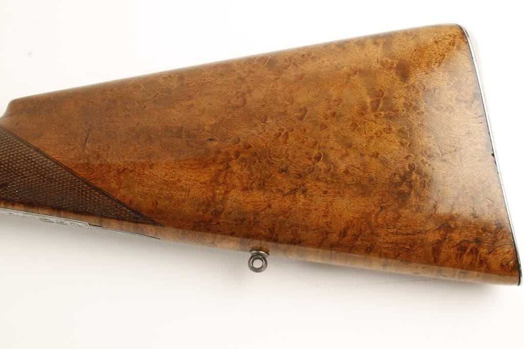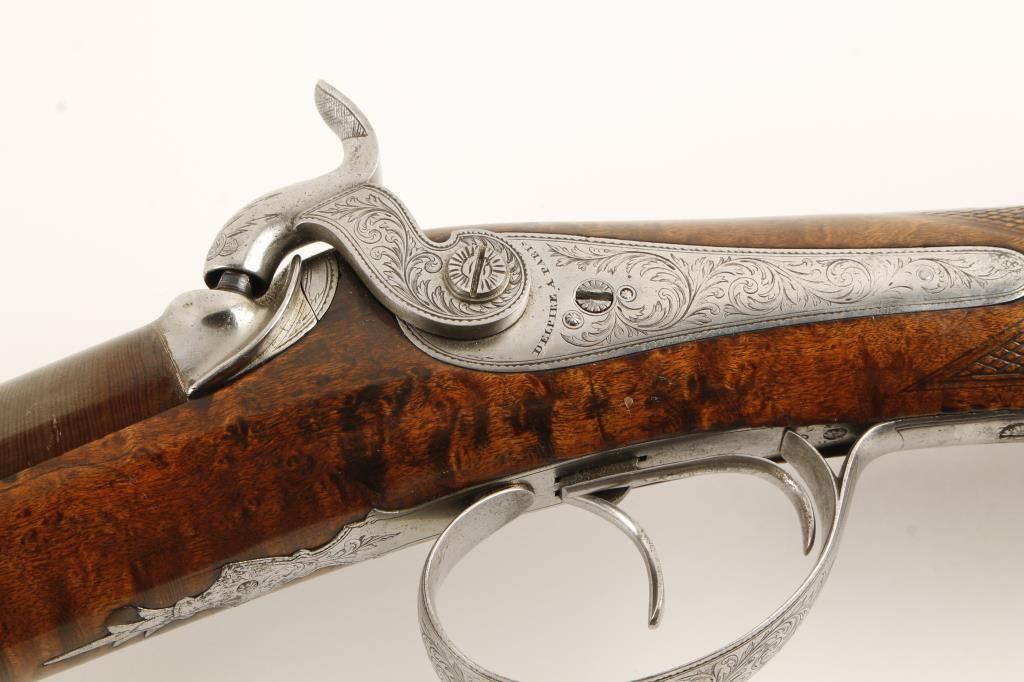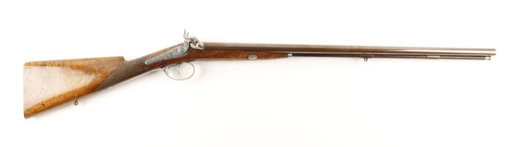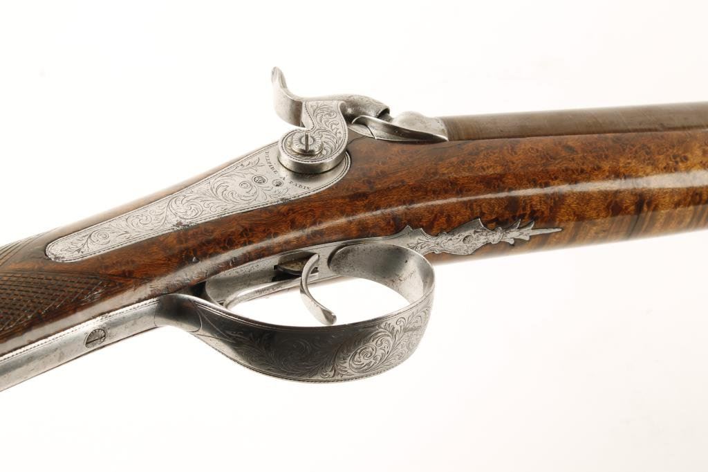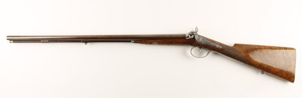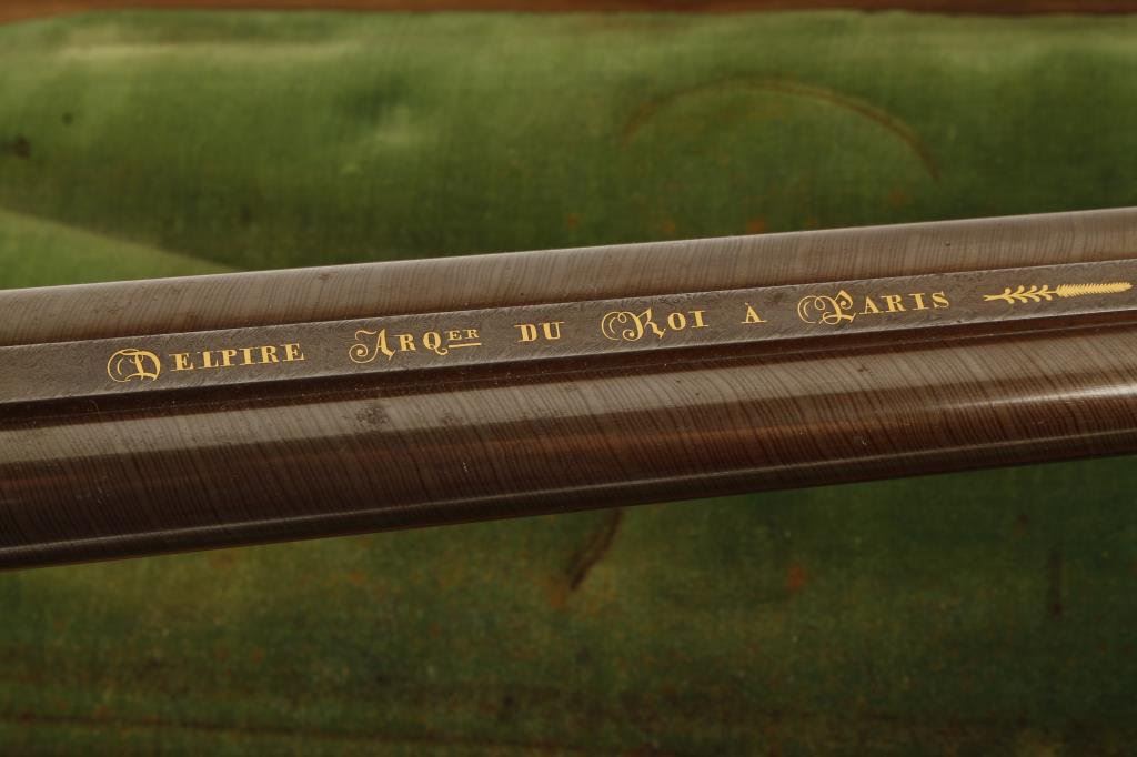 French percussion side-by-side shotgun, cased with accessories, lock plates marked “Delpire A Paris”; 16 gauge, 27.5” barrels with wood cleaning rod; engraved lock plates, hammers, trigger guard and butt plate; checkered root burlwood stock; fine gold inlaid address on top barrel rib “ELPIRE/ARQER/DU/ROI/A/PARIS”; crisp actions and markings, finely finished barrels, fine wood stock with some minor storage scratches. Casing is overall good with need for some restoration to the lid and inside lid lining that has come detached; accessories include 2 flasks, bullet mold, cleaning rod, patch cutter, etc. Est.: $2,500-$5,000.